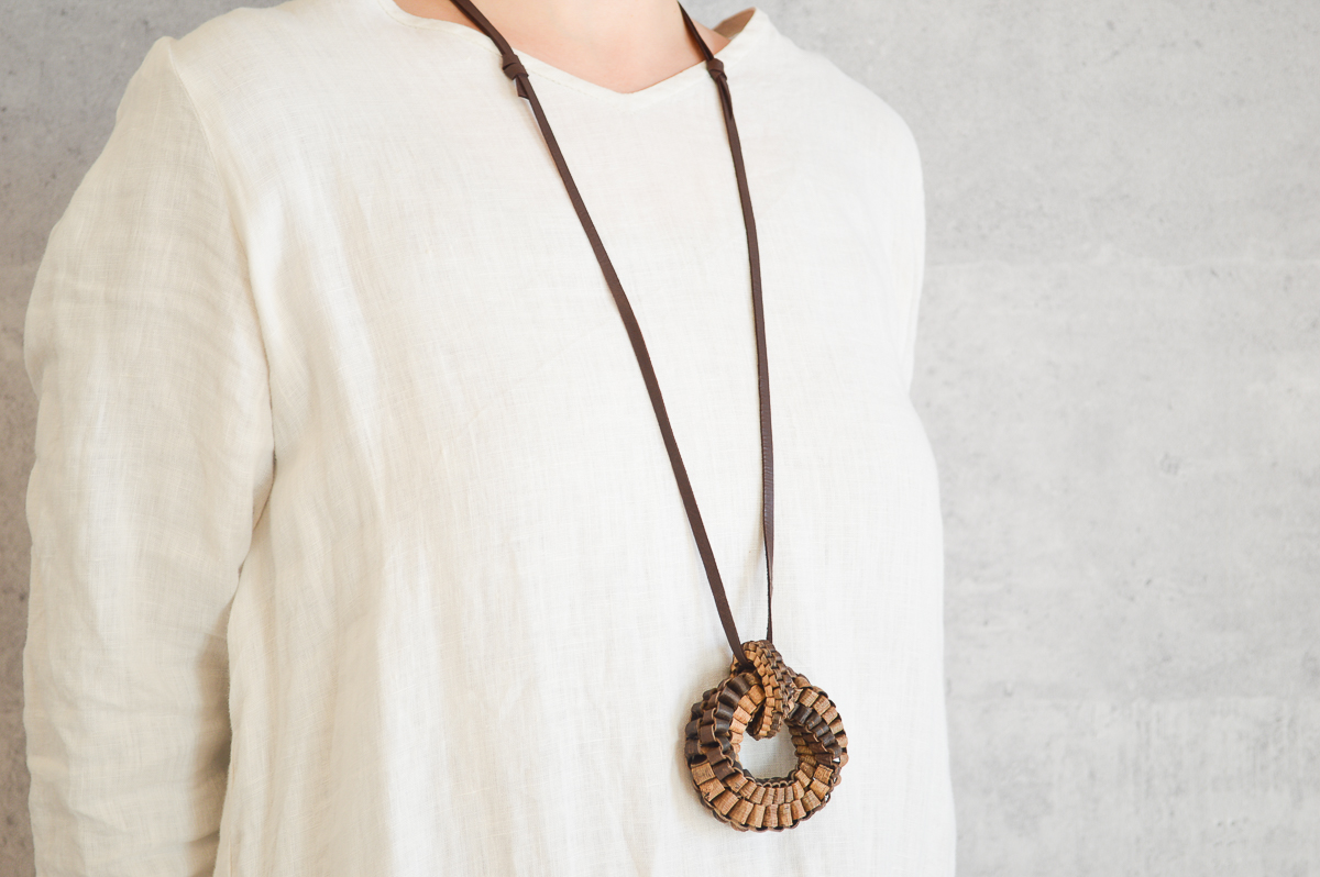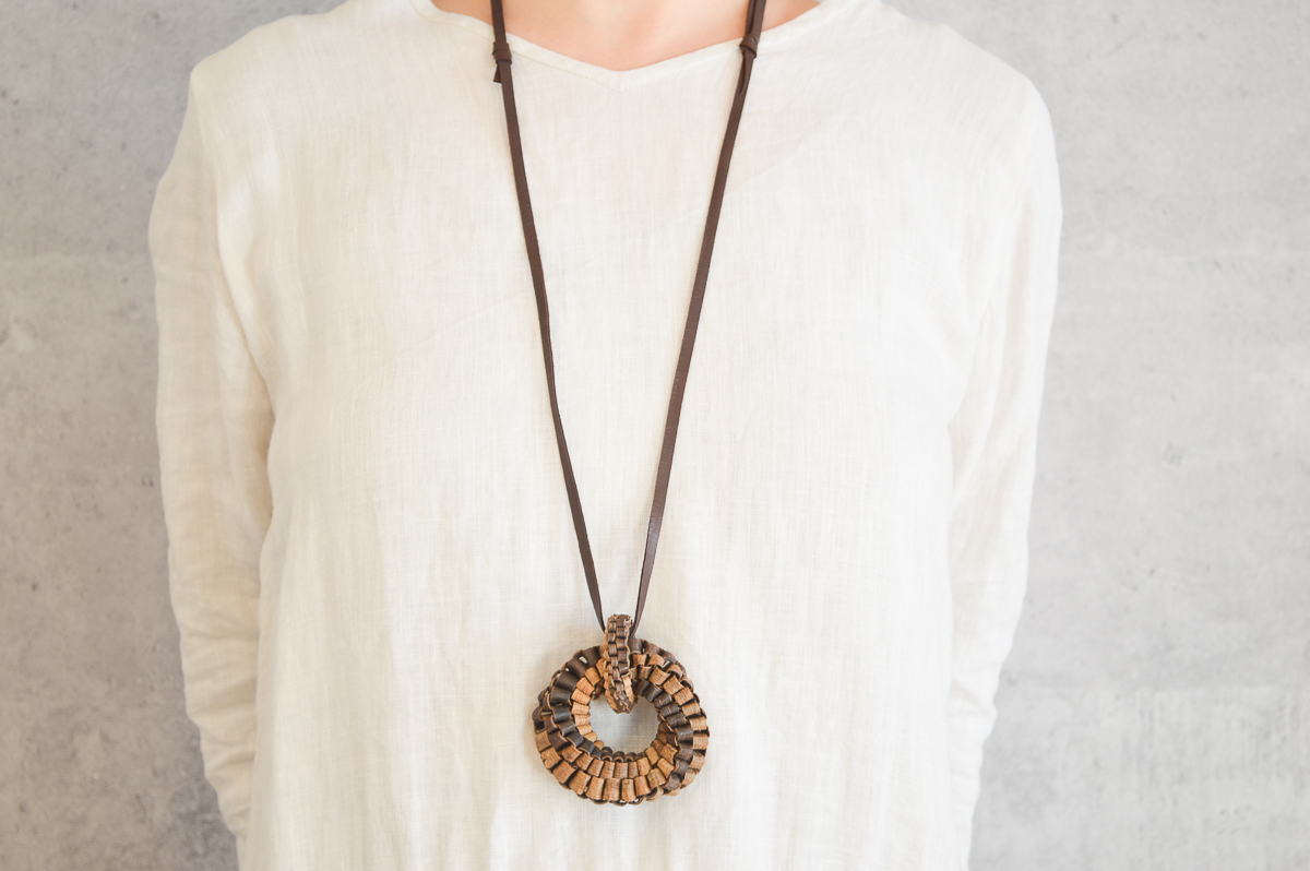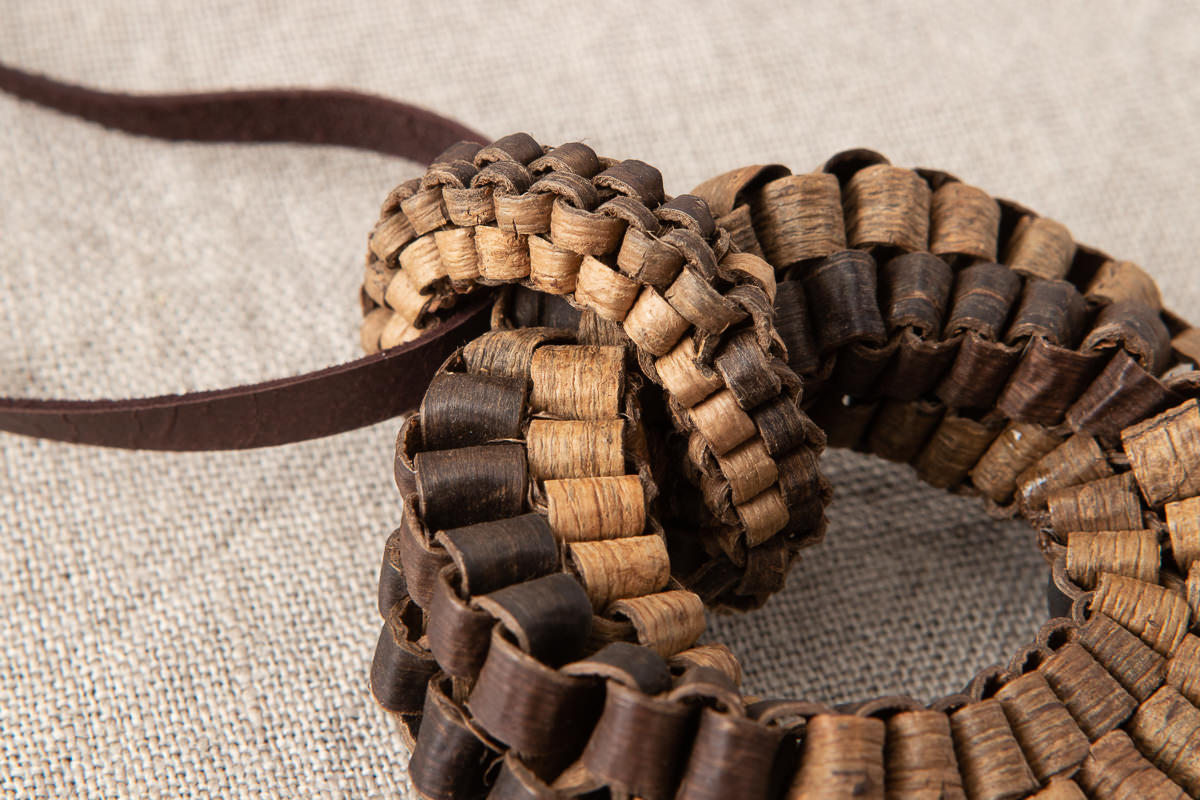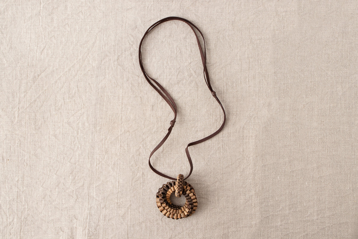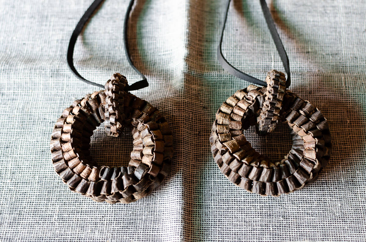 こちら、くるみの樹皮を使って編まれたヘッドのついたペンダントをご紹介します。