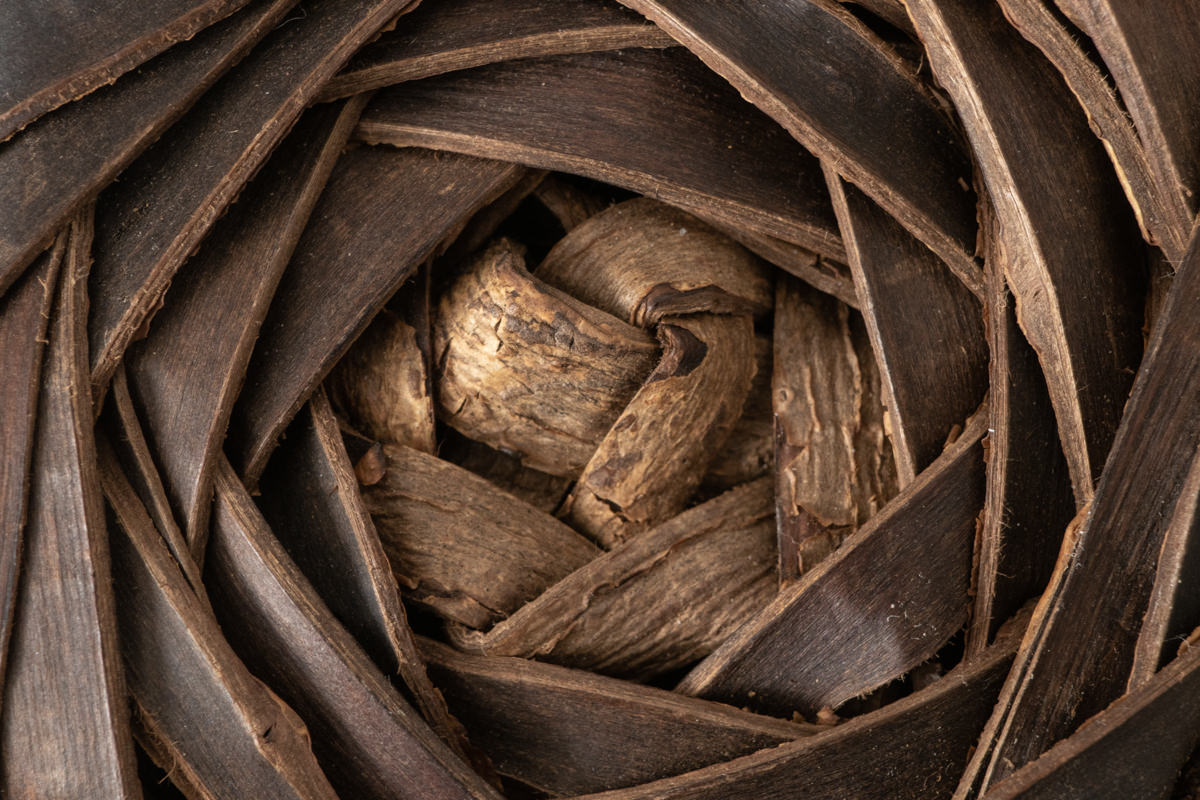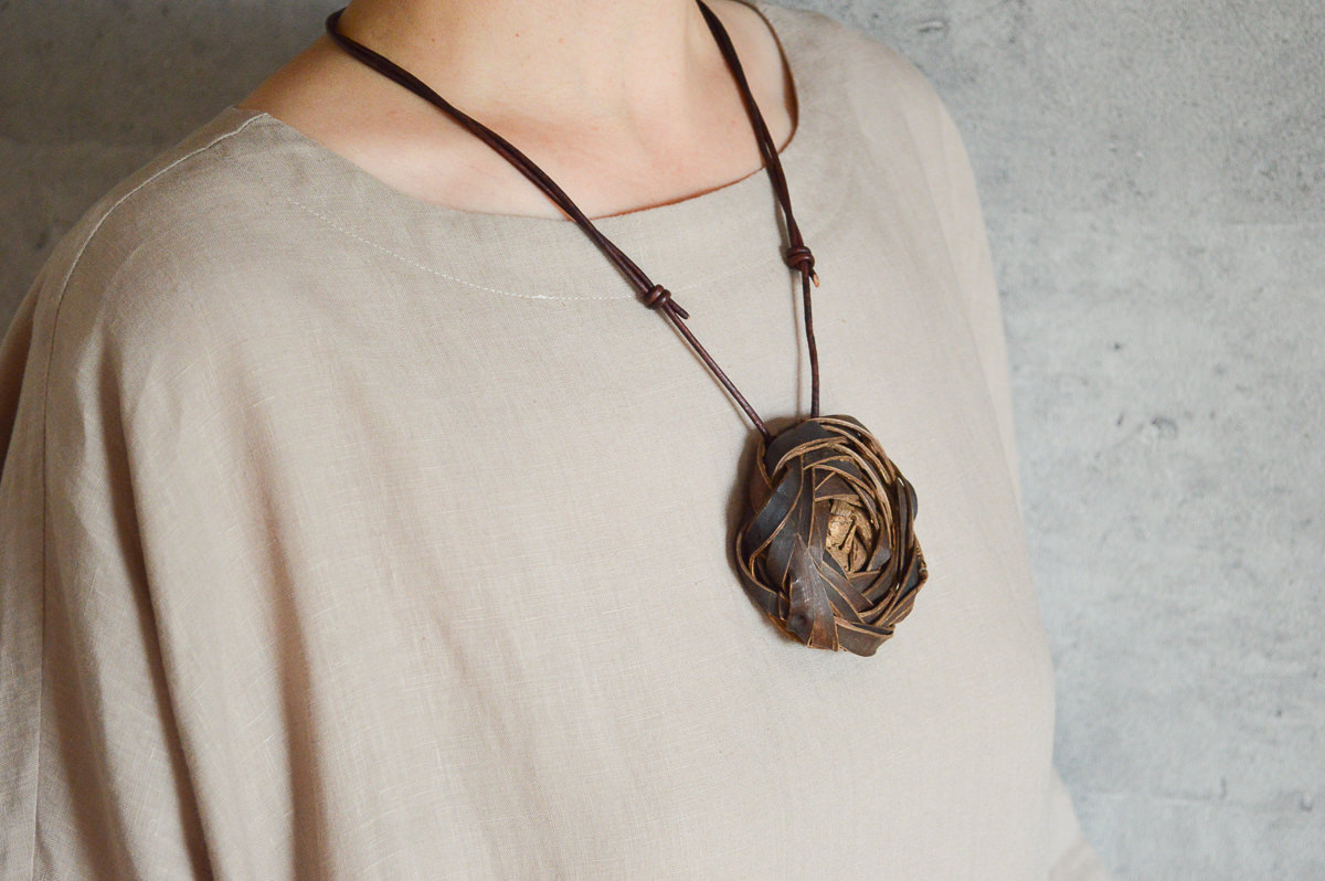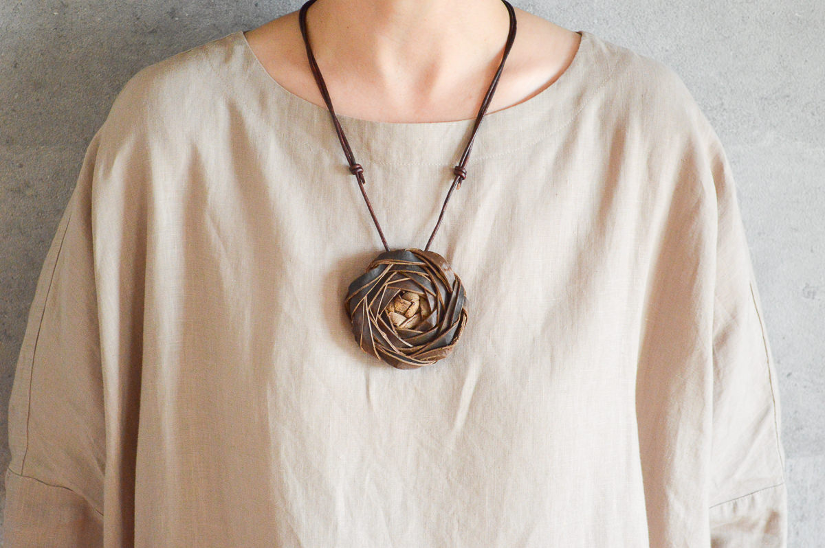 こちらはくるみの樹皮をバラのような形に編んだペンダントです。