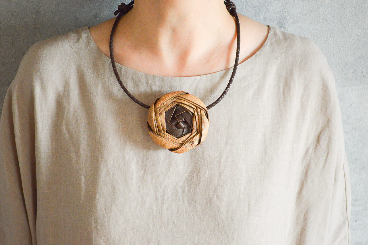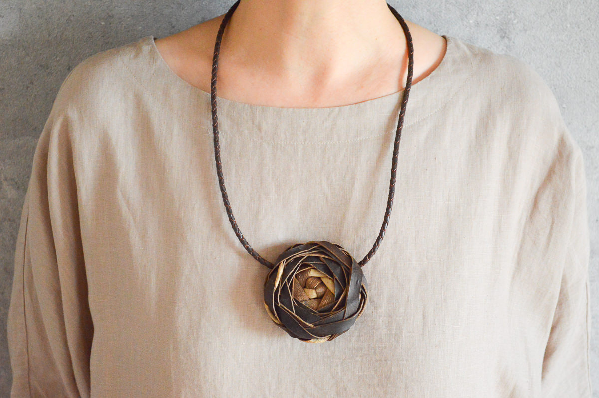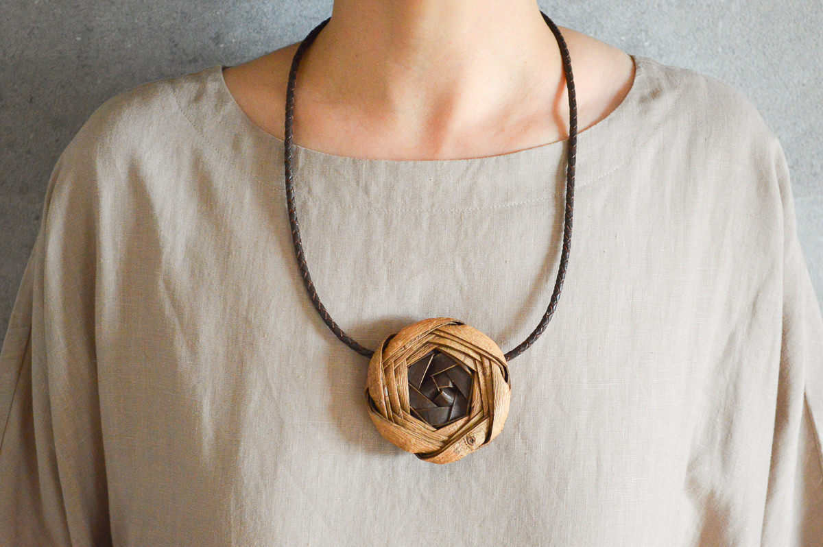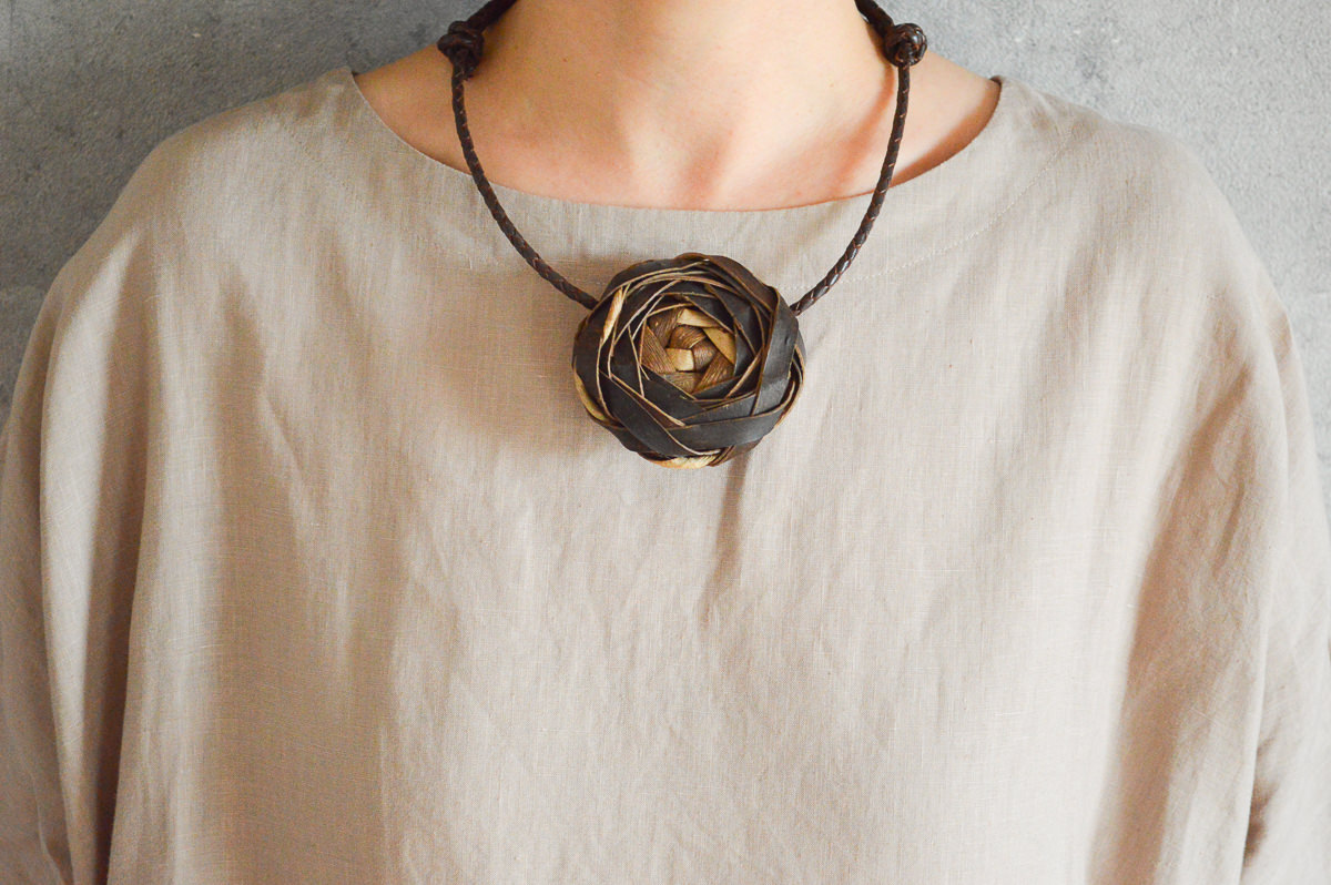こちらはくるみの樹皮をバラのような形に編んだヘッドのついたチョーカーです。