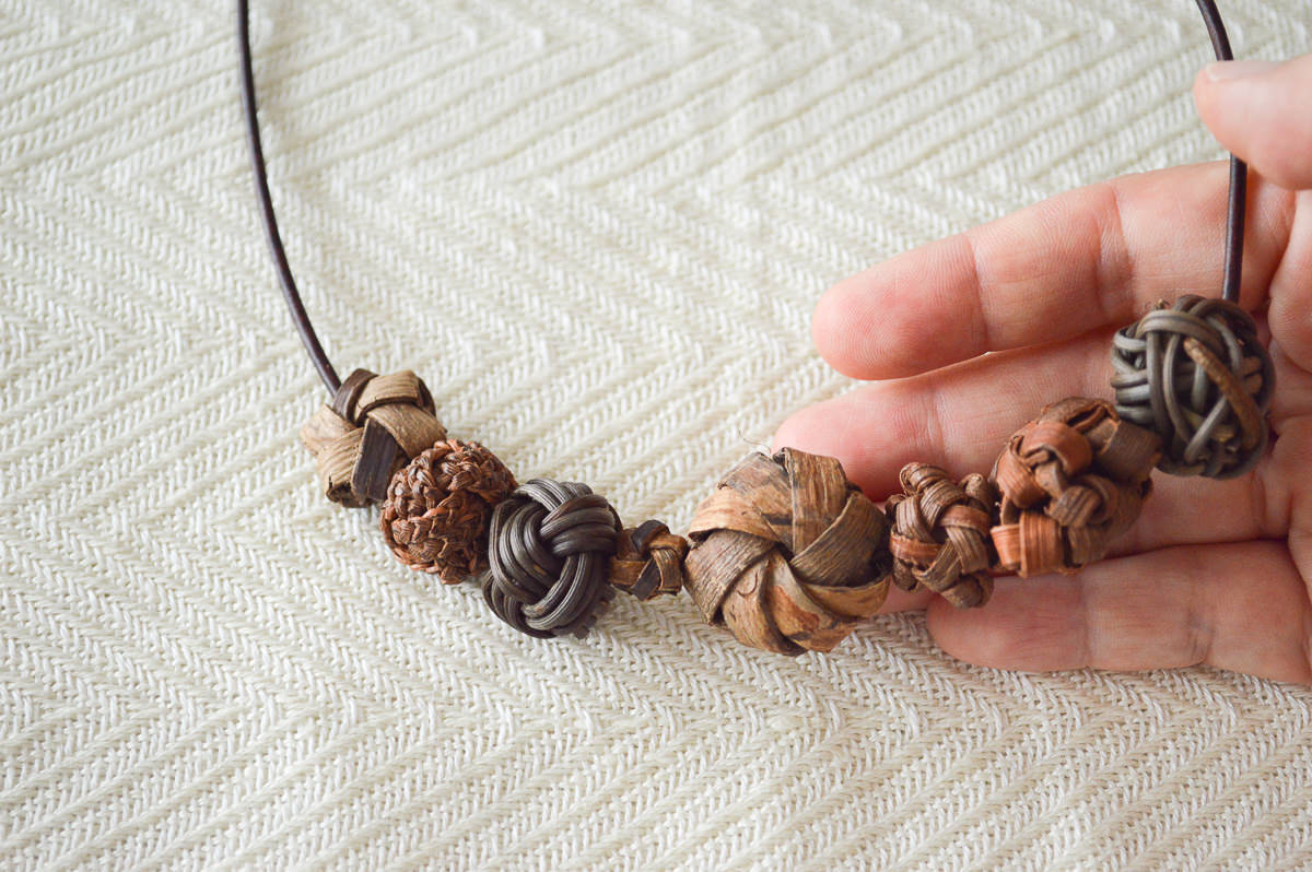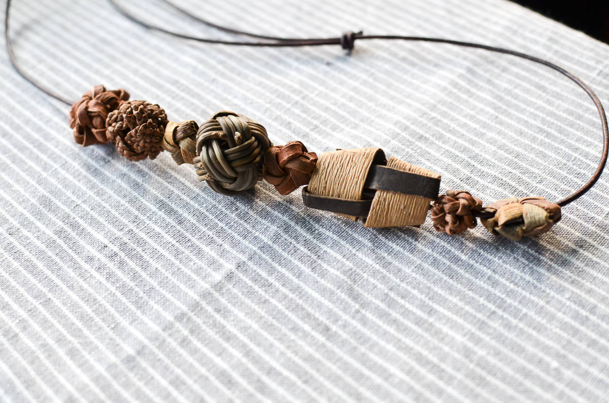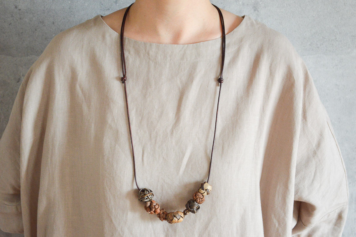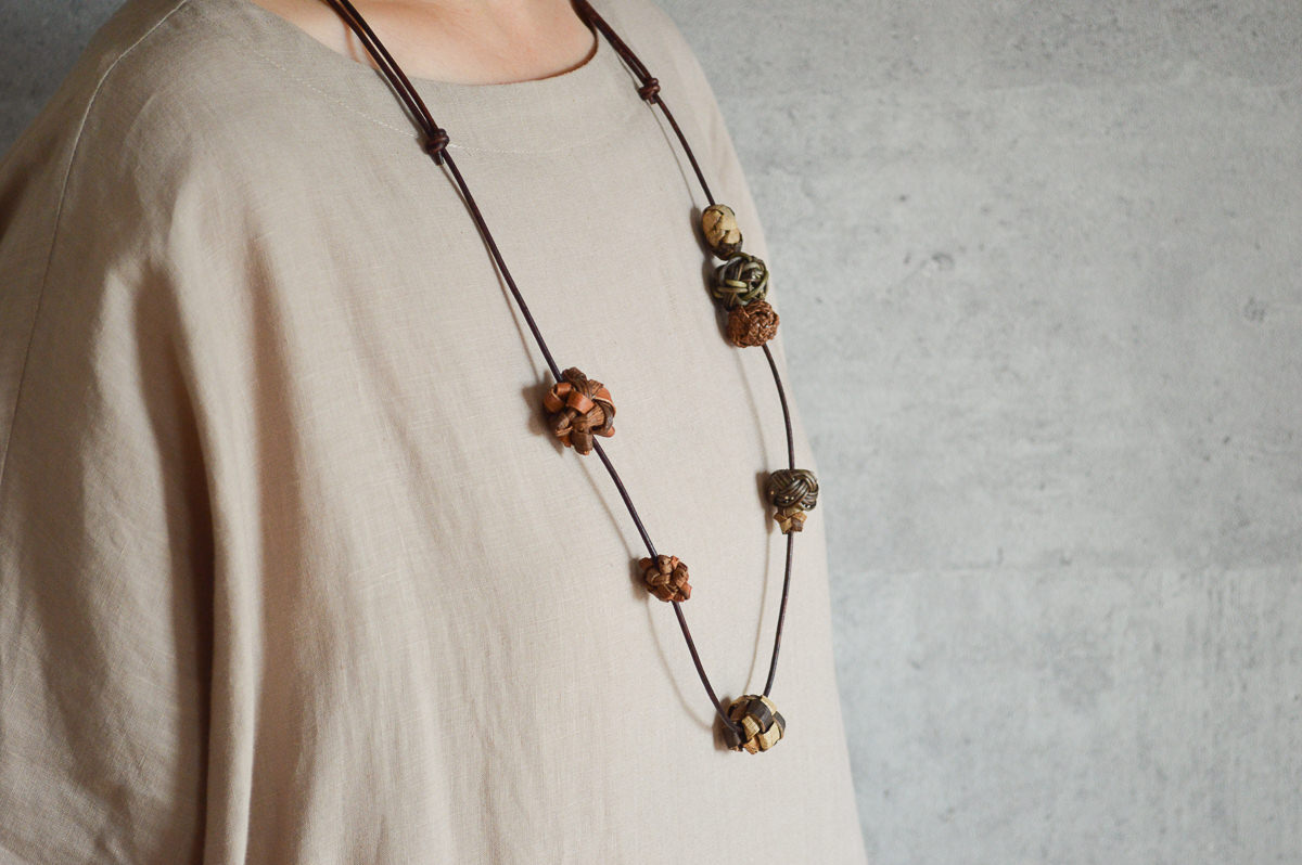 こちらはやまぶどうとあけびの蔓、くるみの樹皮を使ったロングペンダントです。