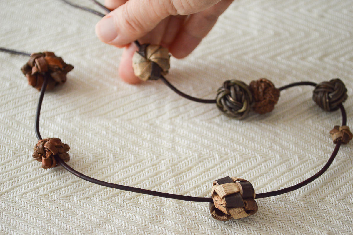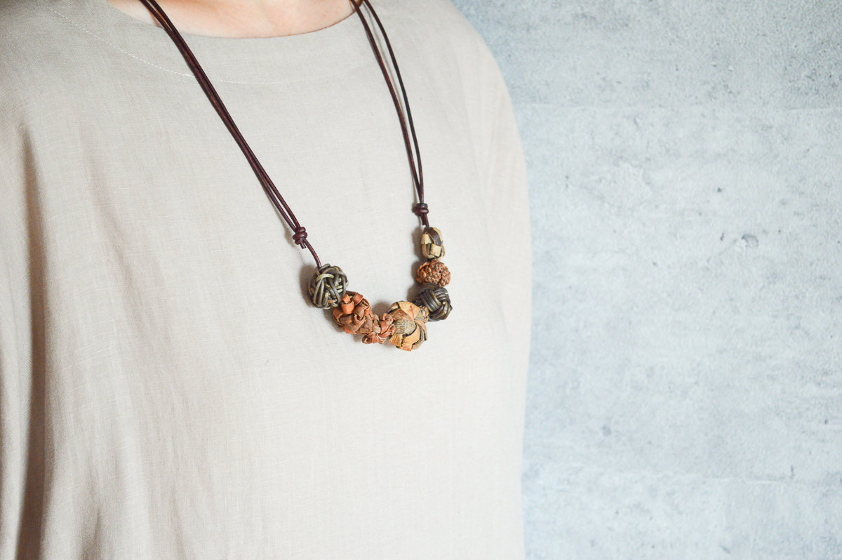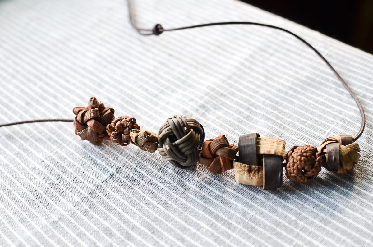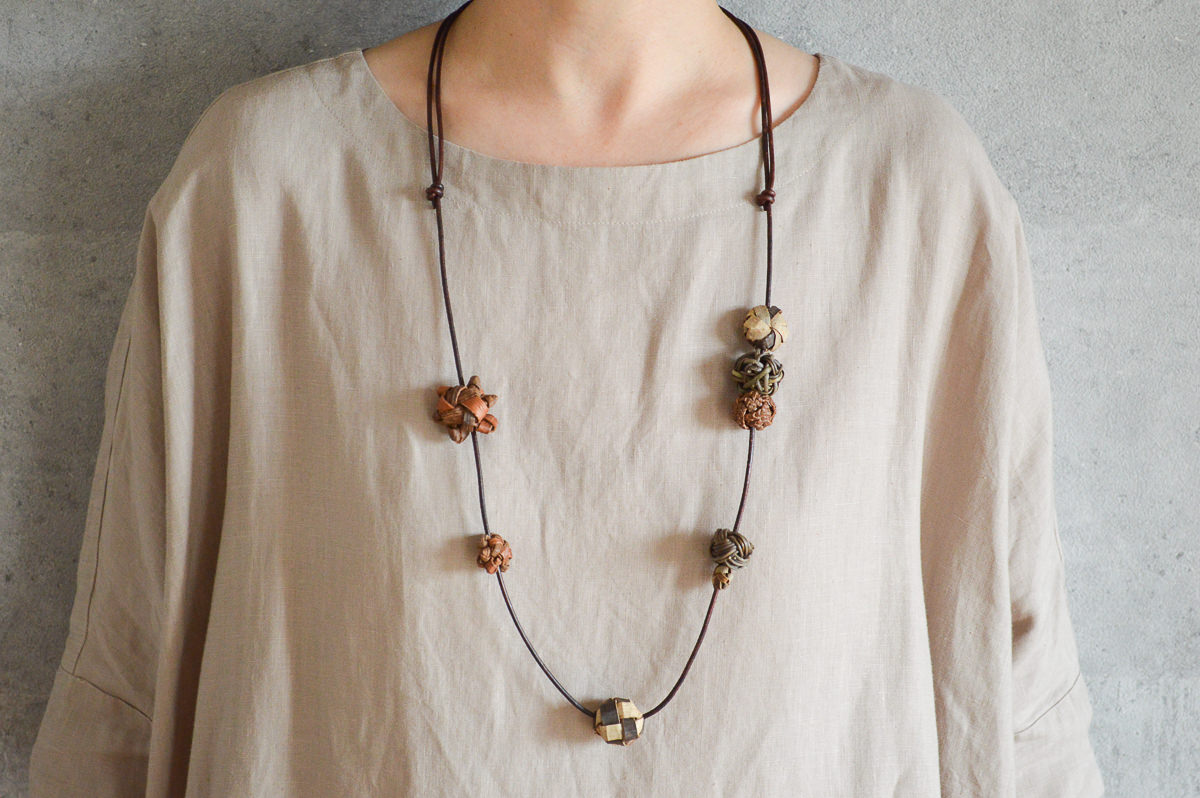 こちらはやまぶどうとあけびの蔓、くるみの樹皮を使ったロングペンダントです。