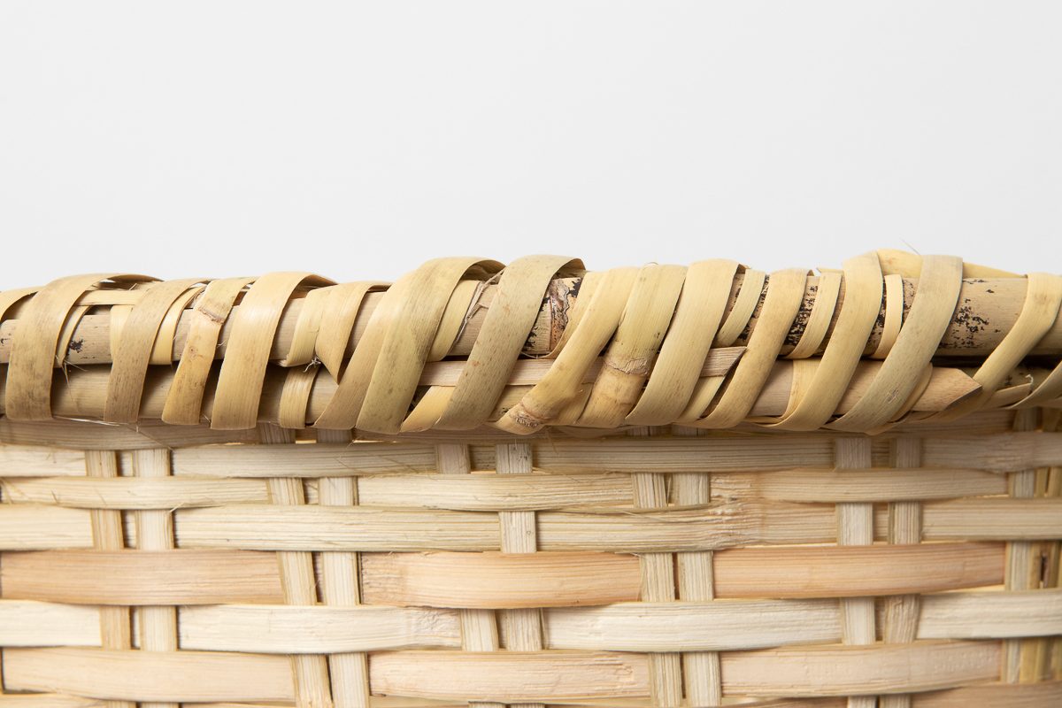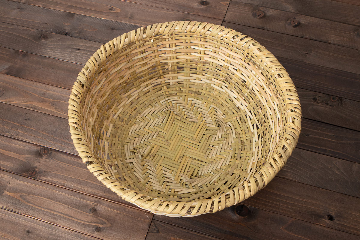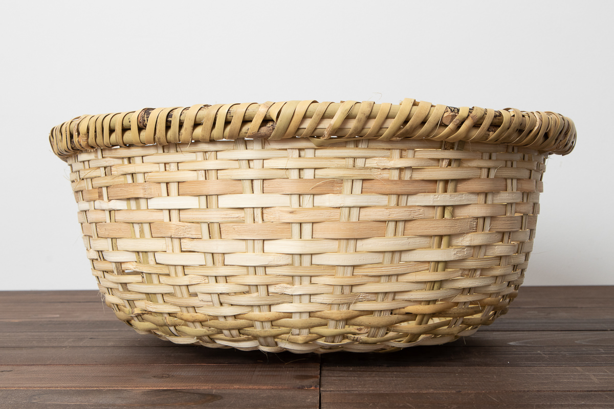 両手で持ってちょうどよい大きさです。肉厚に作られたひごで編むかごは頑丈そのものです。