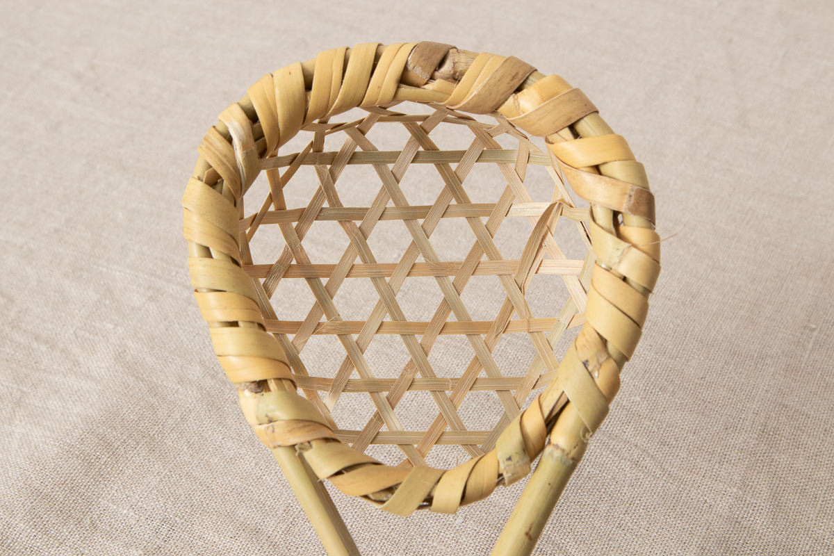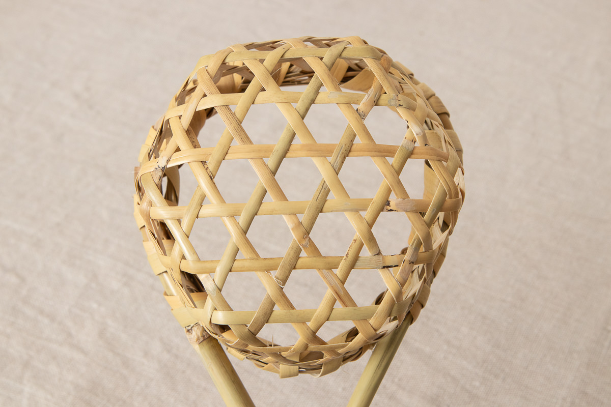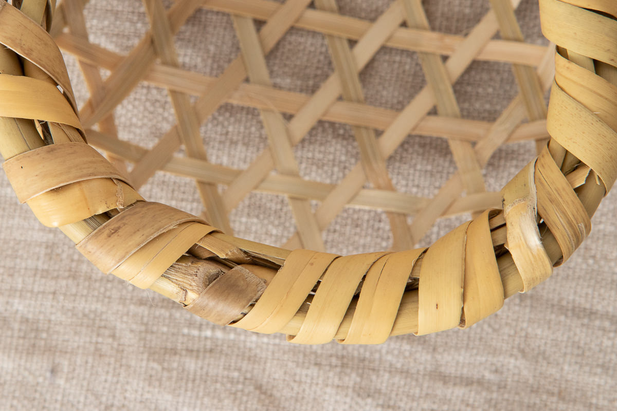 小さい円のものは、縁巻きが難しいと言われますが、芯材となる丸のままの根曲竹に、ひごを無理なく、かつ着実に巻きつけています。