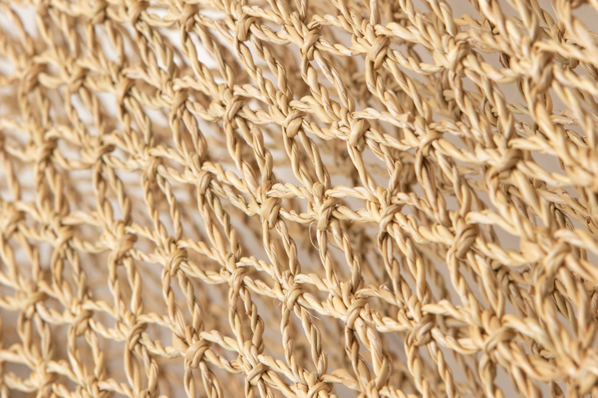 縄を綯った(なった)ものを、木の枠型を使ってそこに編み付けるようにかごを成形していきます。縄綯い(なわない)をしたコックは、強度が増してさらに丈夫なかごとなります。編み方は、日本で「七宝(しっぽう)編み」や「マクラメ編み」と呼ばれる手法と同じ編みです。七宝編みは伸縮するのが特徴で、こちらの手提げも物を入れることで多少下に伸びます。