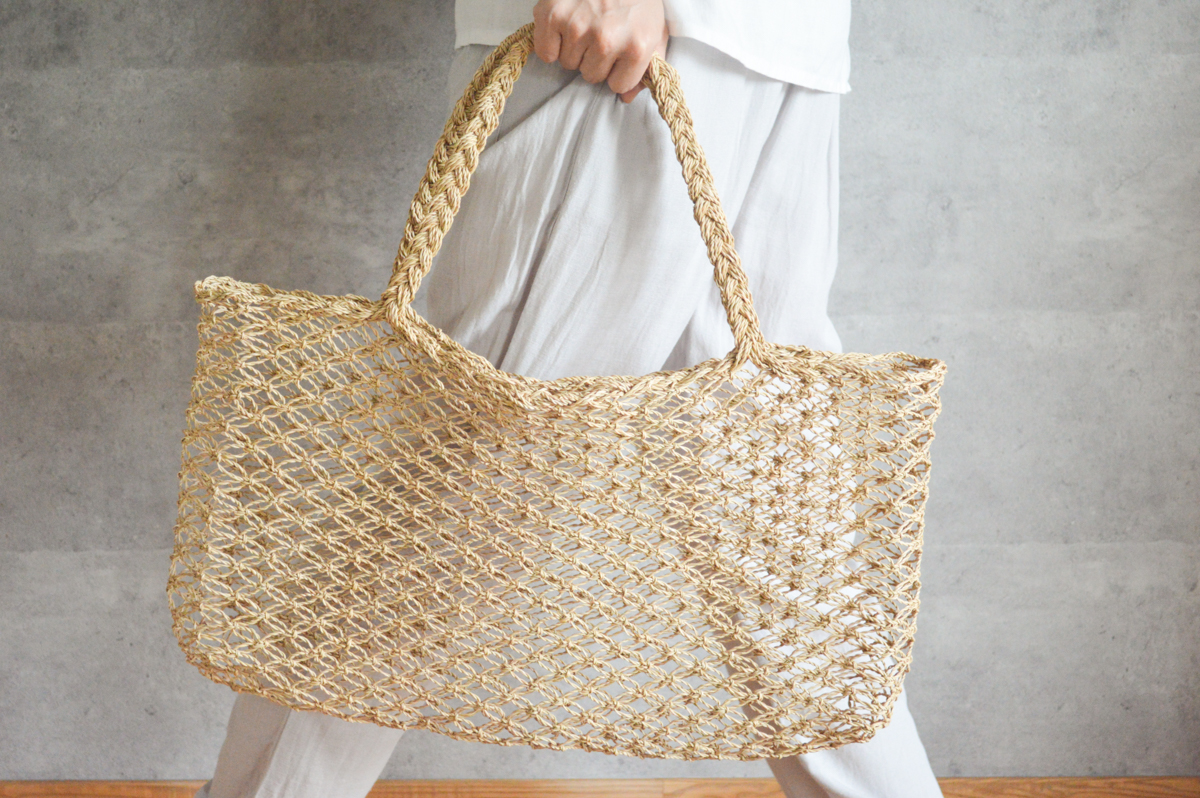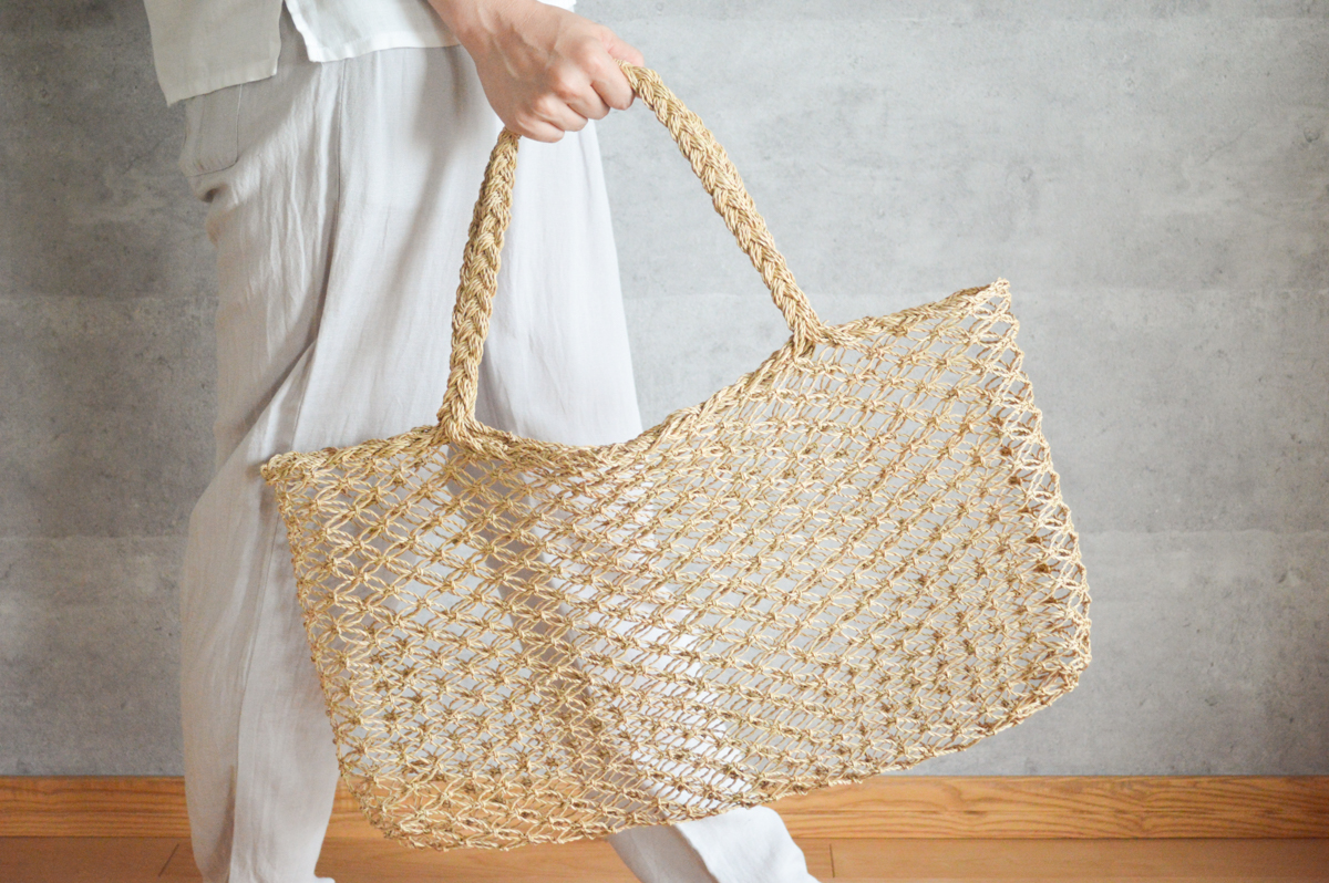 横幅が広く薄型で、編み目の開いた涼しげな手提げ、2サイズをご紹介します。