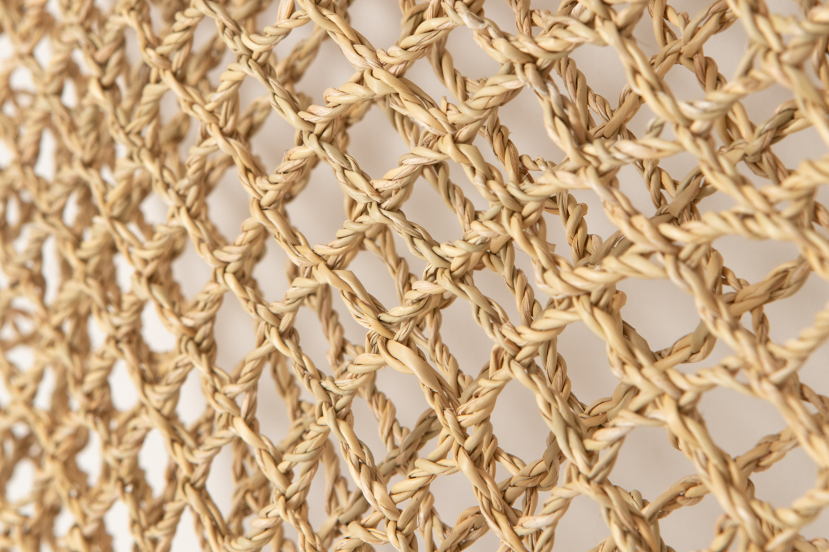 二本ずつの縄をねじりながら交差させ、格子状に編み目を作っていっています。軽く引っ張ると上下左右に少し伸縮します。