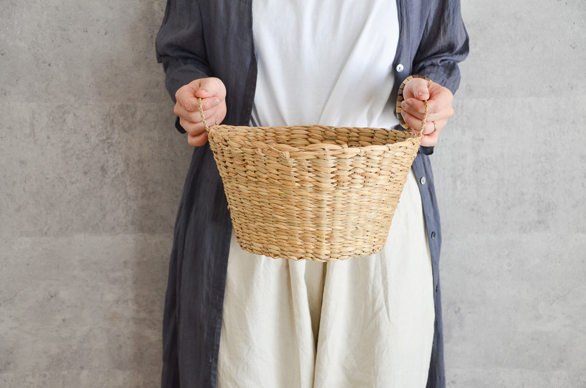 縁は、かご本体を編んだ縄を編み込んで留めています。持ち手もコック製です。数本のコックを編んだものを持ち手にしています。