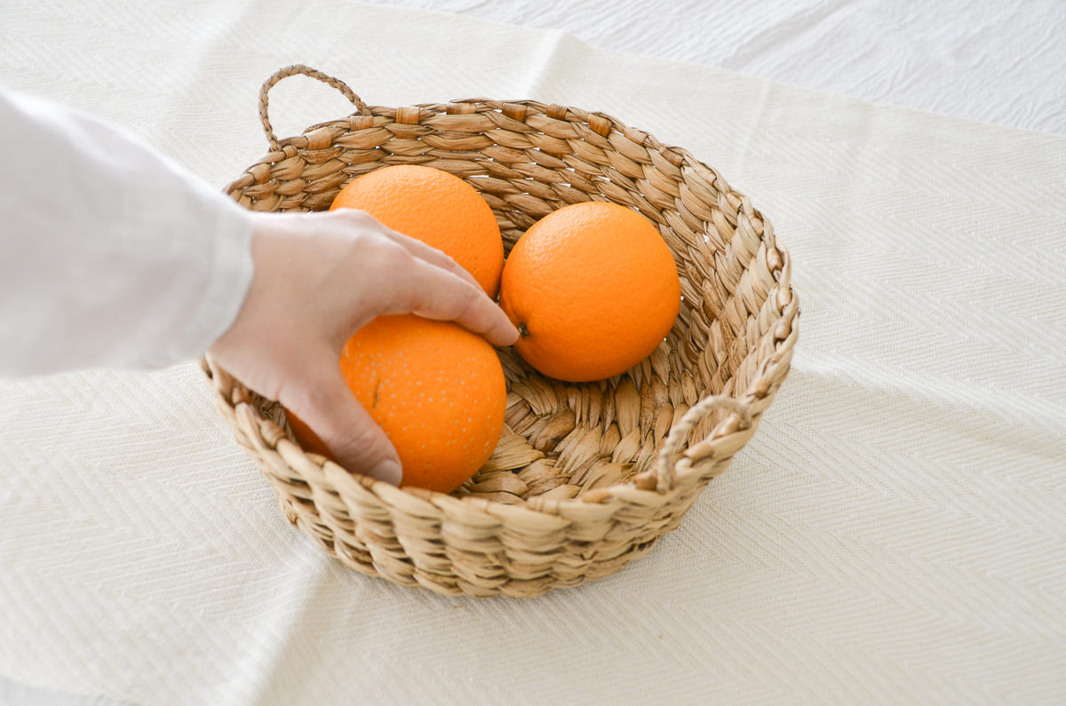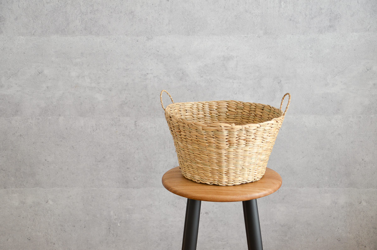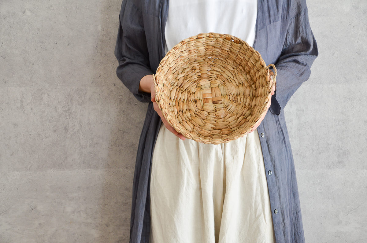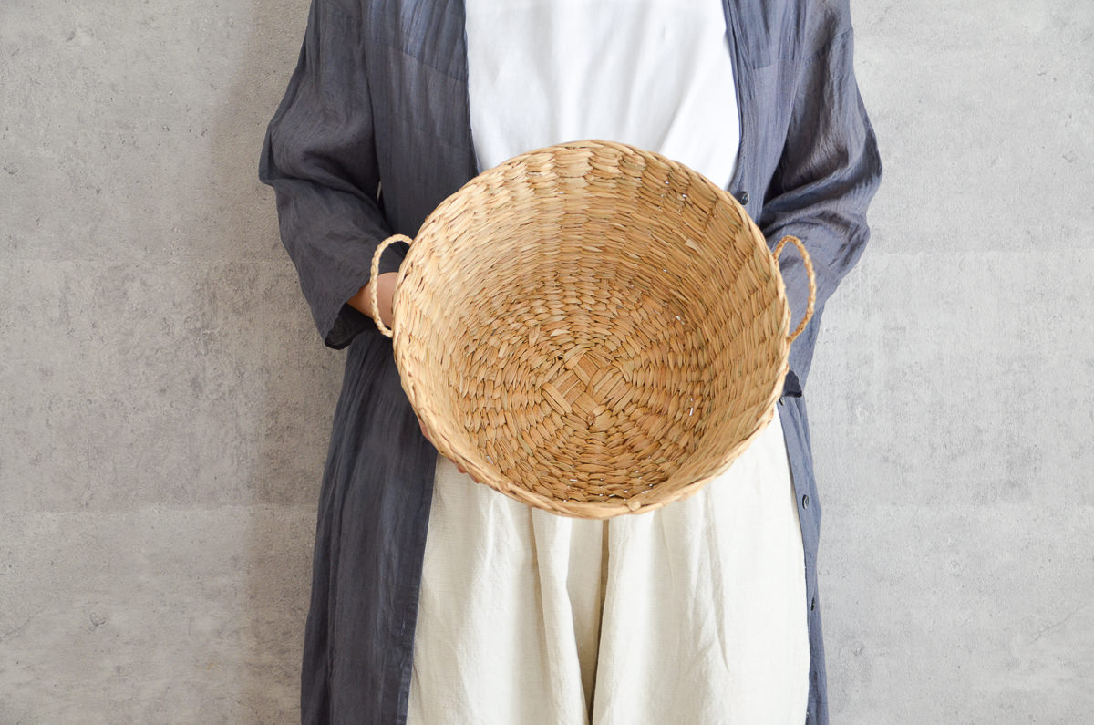 こちらのページでは、縁の両側に持ち手のついたサークル型のかご、