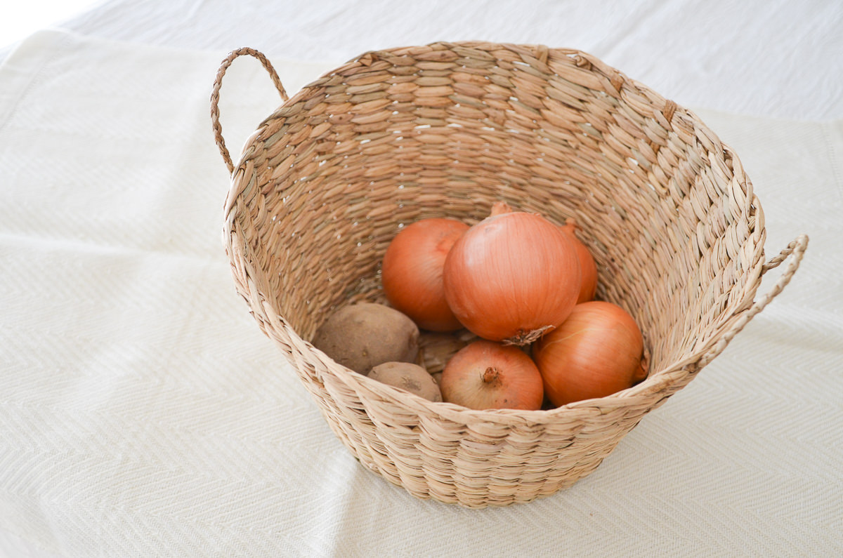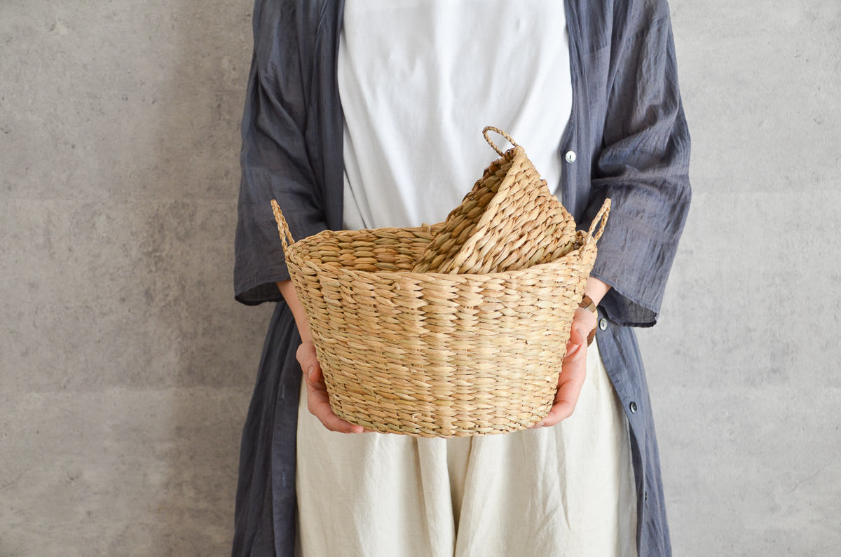 大サイズを根菜のストックバスケットに。ほどよく深さがあり、口がゆるやかに開いた手付きバスケット。