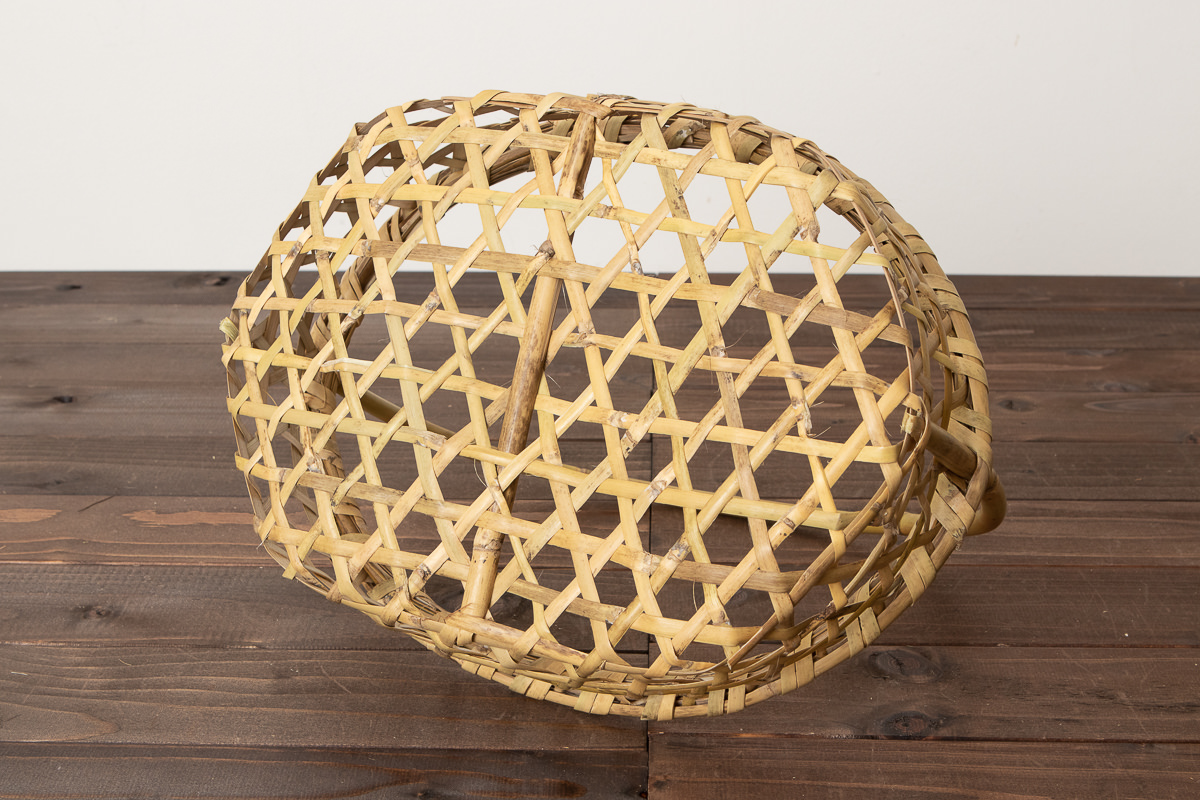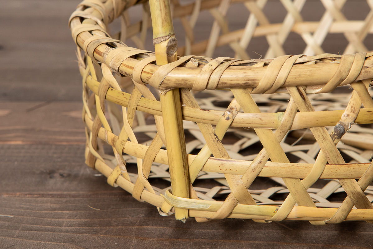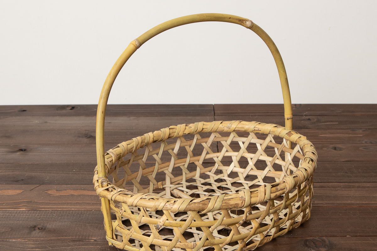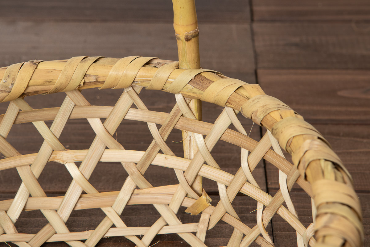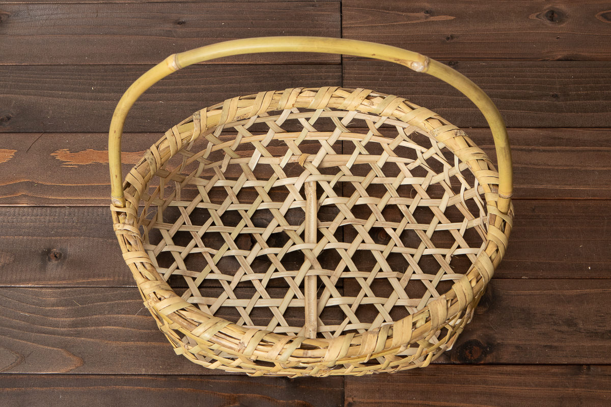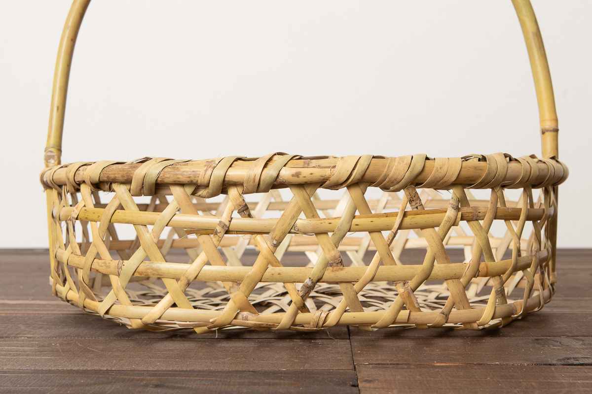 同様に入荷の時期により、作り手さんのご都合で力竹の通し方が違う場合や、側面にまで力竹が差されている場合もございます。力竹については、材料の都合によるところが大きく、力竹のあり・なし、1本・2本を問わず、その時に入荷したタイプをお届けいたします。予めご了承ください。取っ手がついていることで、使える範囲が広くなりそうです。家庭菜園の収穫かごにもよさそうです。