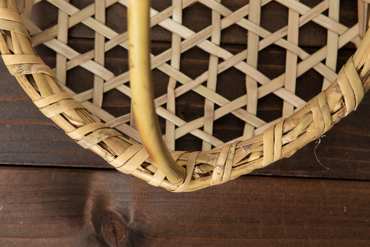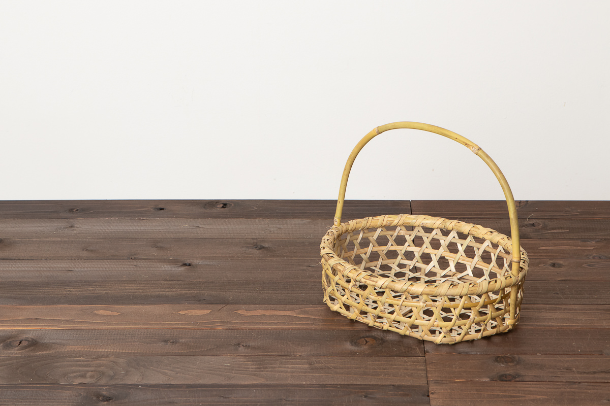 その根曲竹のこちらはシンプルな六ツ目編みのかごに、1本持ち手を渡したかごです。