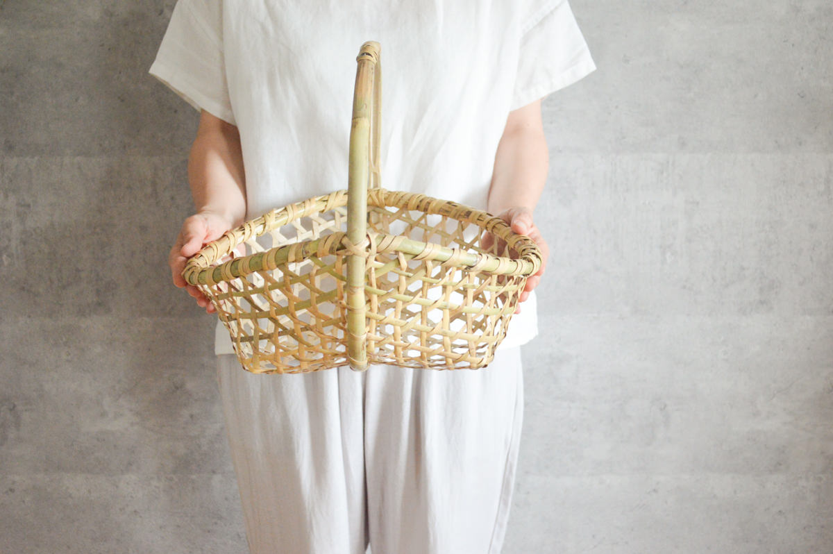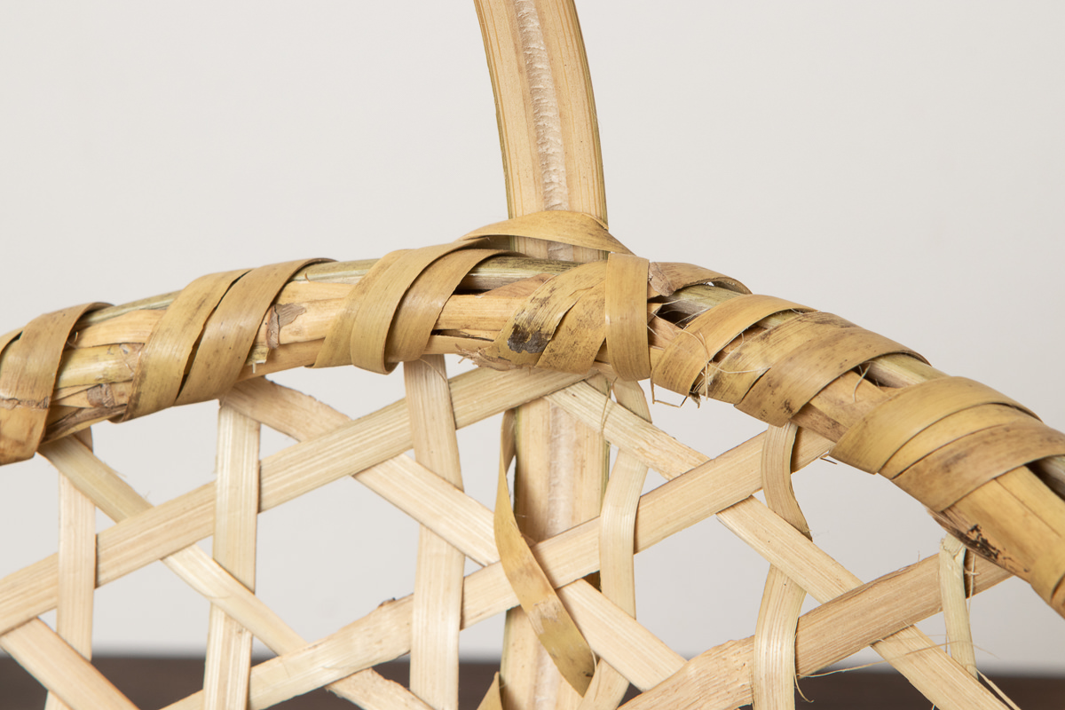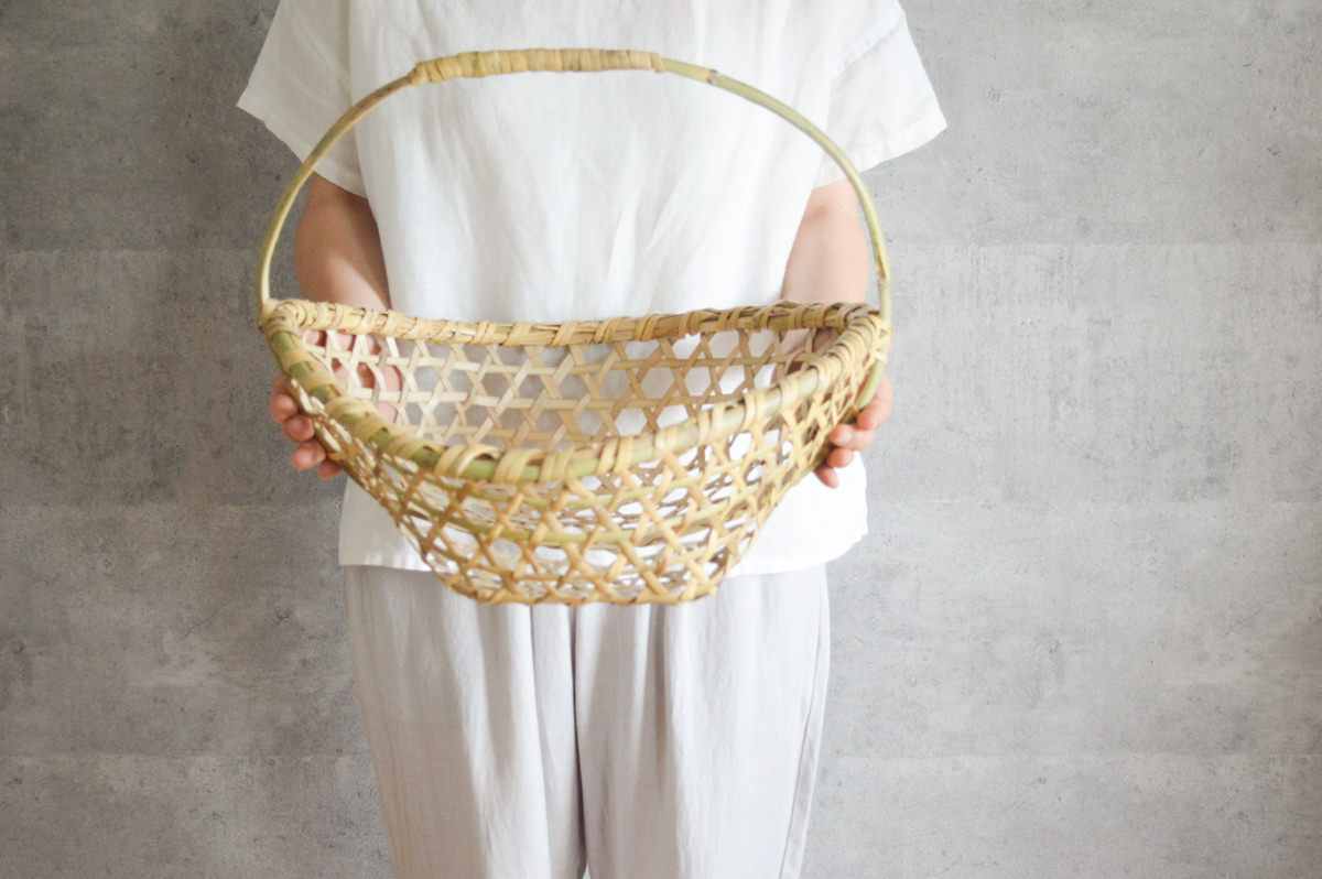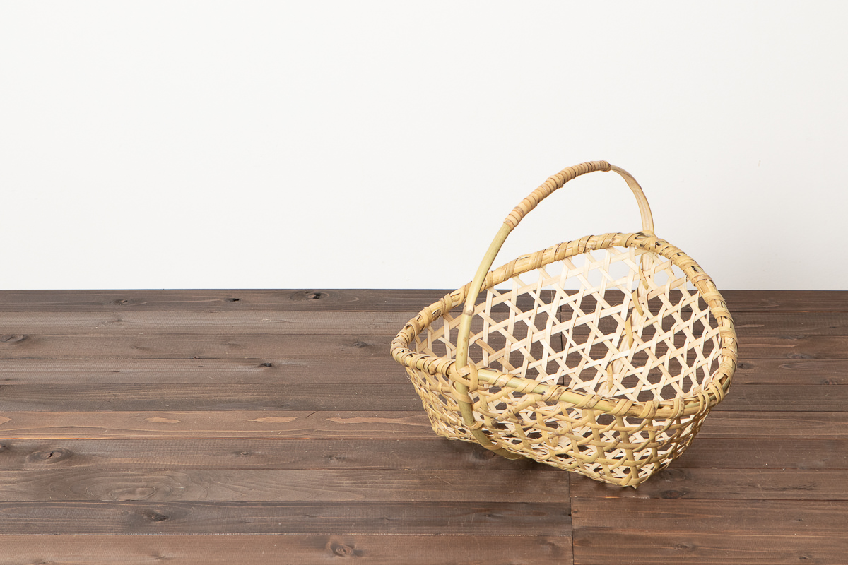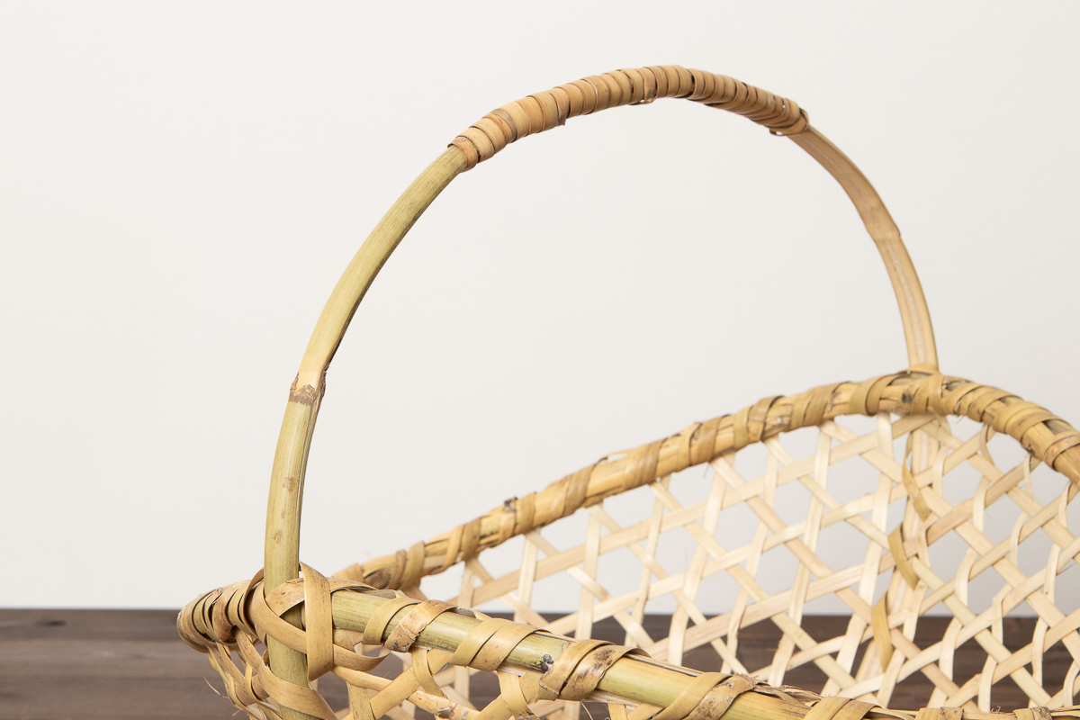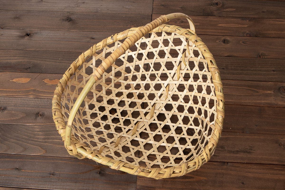 その根曲竹のこちらはシンプルな六ツ目編みではありながら、特徴的な形をしたバスケットです。横から見ると、舟のような形に見えることから、このようなかごには「舟形」などという名前がつけられます。