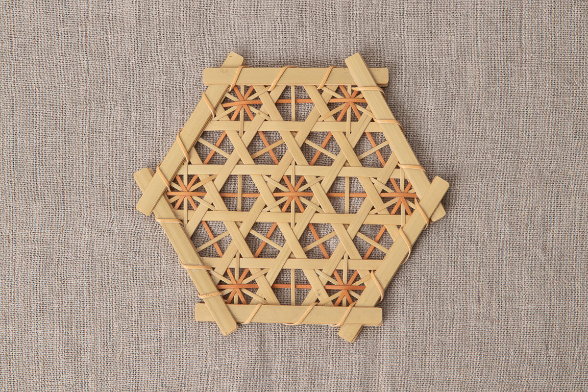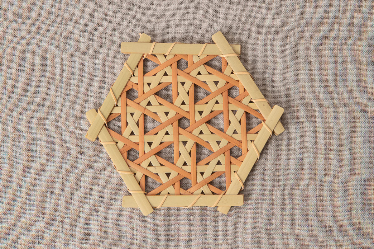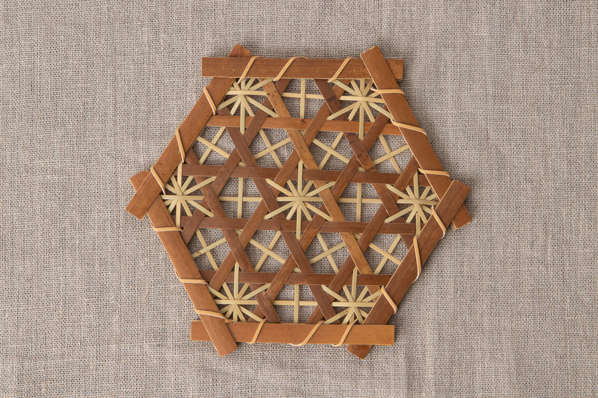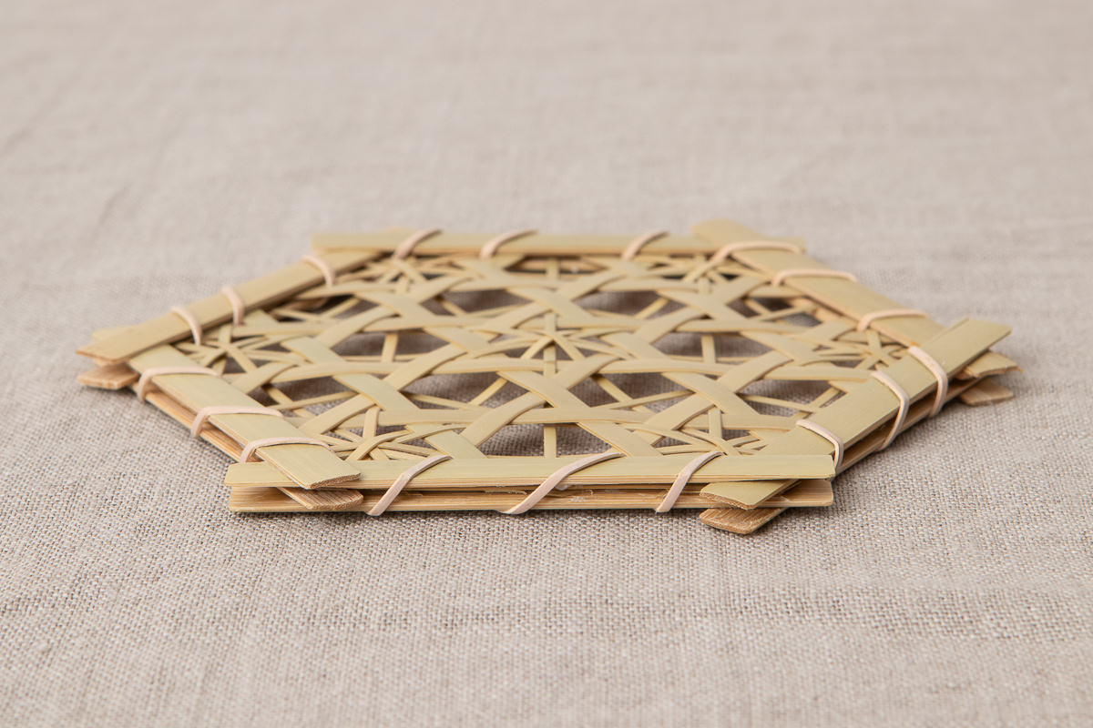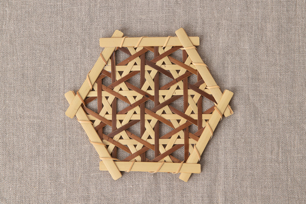最後は差し六つ目編みのブラウンです。草木染のものと同じように、生成りの六つ目編みのベースに燻してこげ茶色になったひごを差しています。生成りの色とコクのあるブラウンの他にはないコントラストが良いです。あつあつのやかんや小鍋の置き場所として。