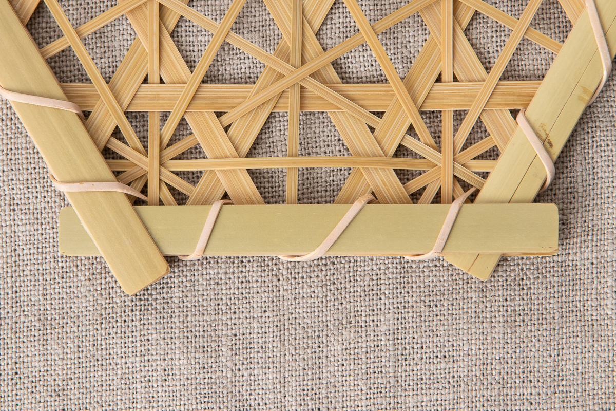 こちらは桂竹の色そのままの「生成り」です。ベースの六角形をかたどる六つ目編みにとても細いひごを細かく差していき、菊の花をイメージさせるような編み模様が広がっています。