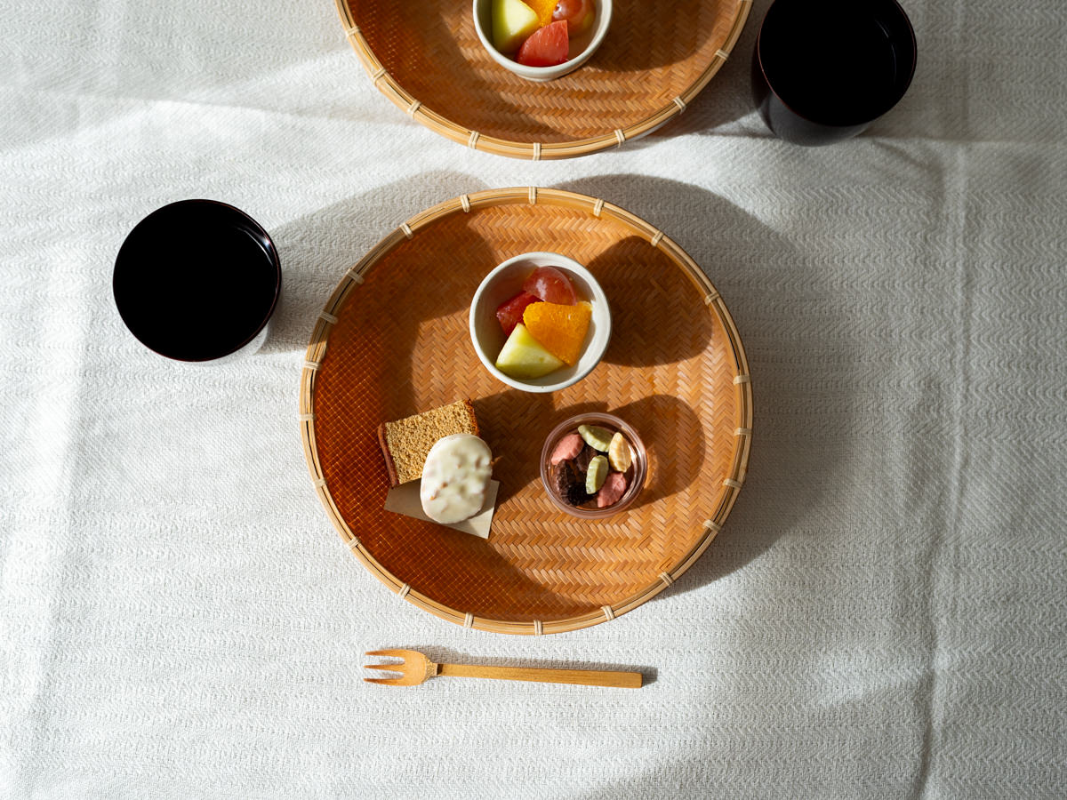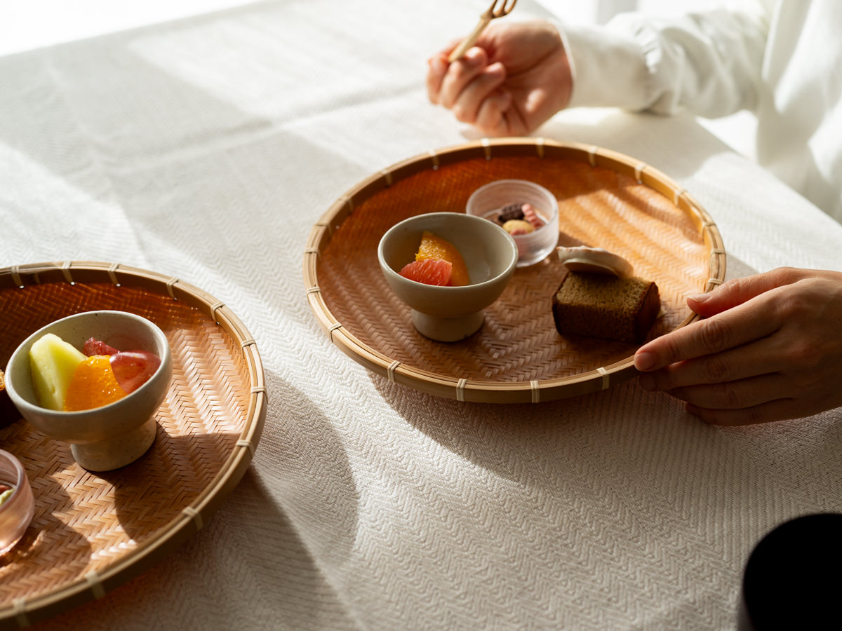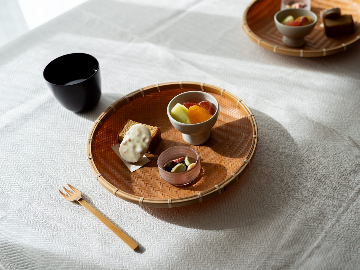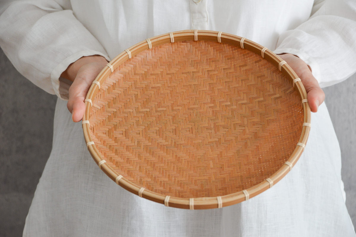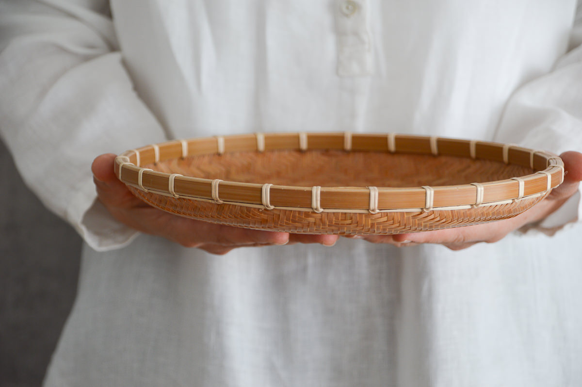 薄いひごから編まれた軽やかな一枚の竹皿。そこから生まれる奥行きのある模様は深みがあり、飽きることがありません。