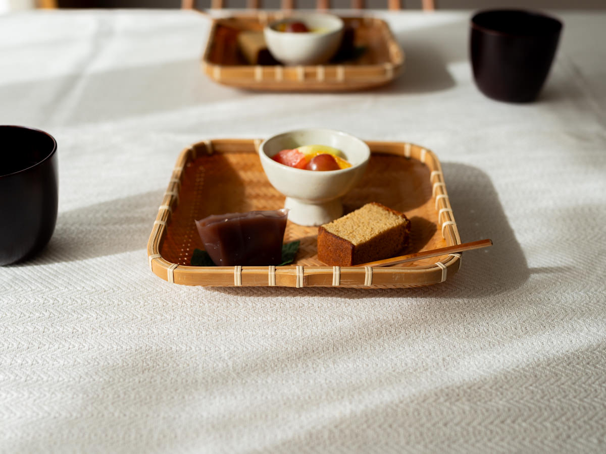 または、お茶の時間に。ようかん、カステラ、小鉢に盛ったフルーツをすこしずつのせて。