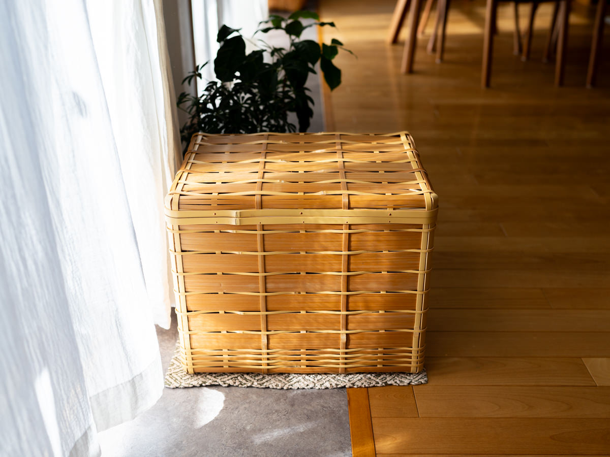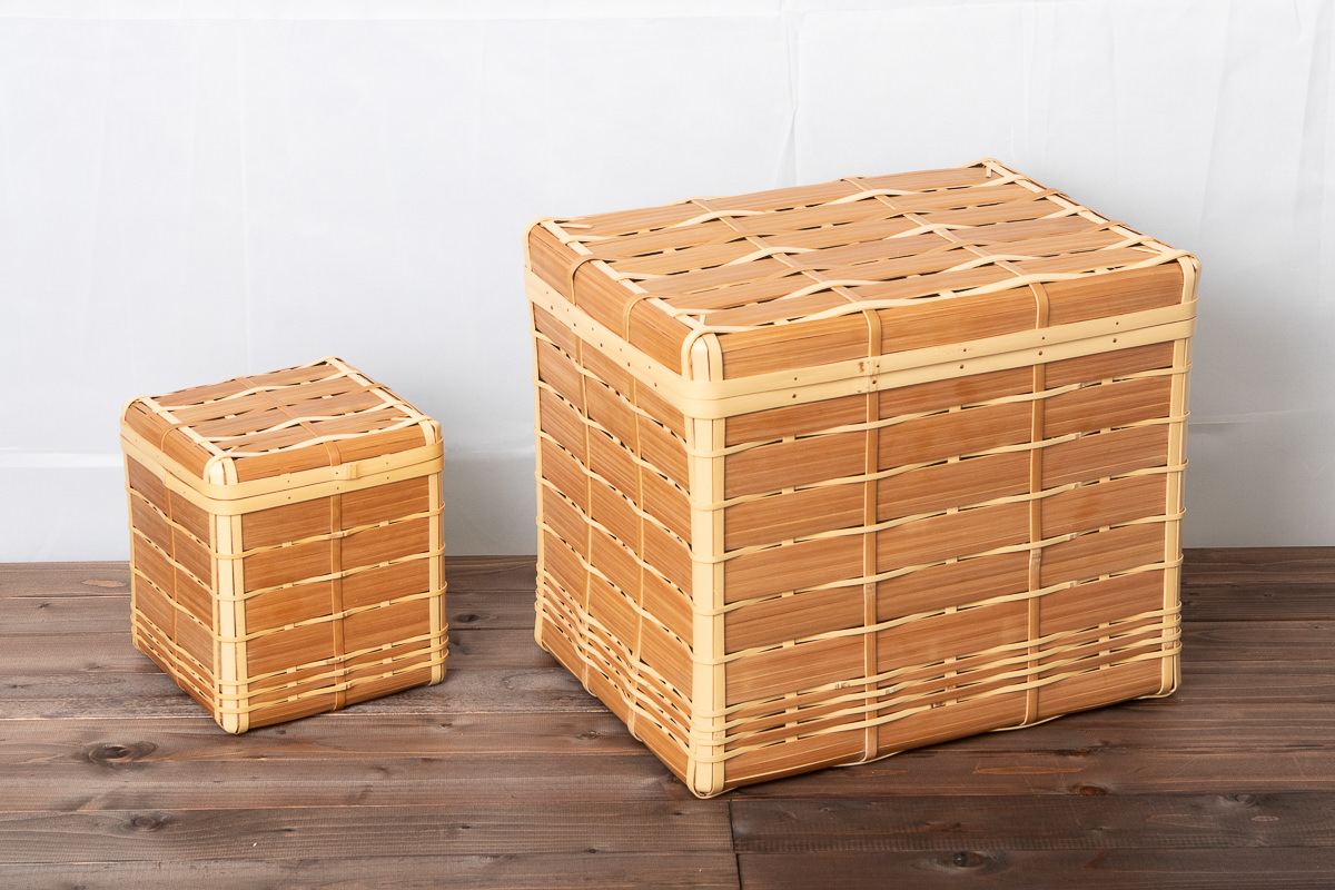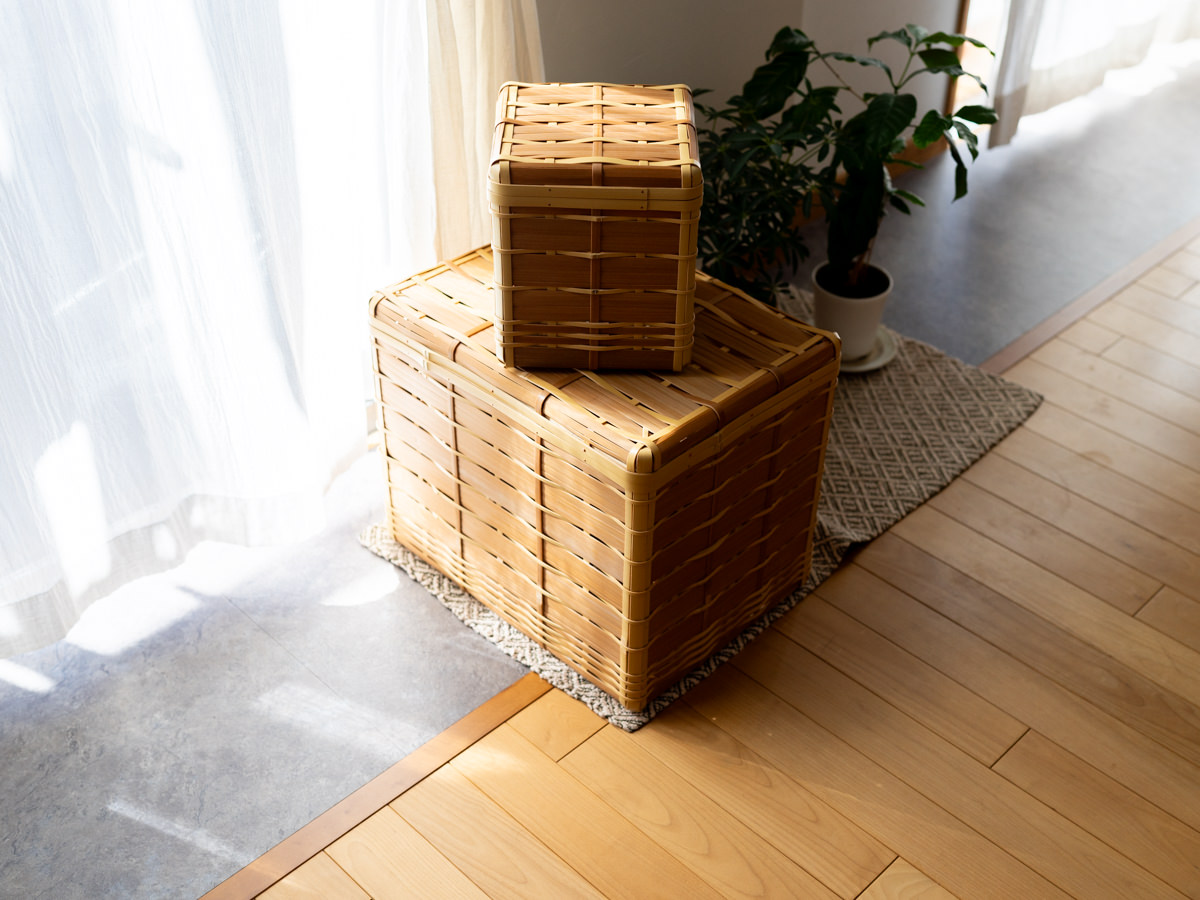白竹と炭化竹を組みあわせた、箱型のかご。こちらは炭化竹のひご表面をけずることでみがかれており、均一の揃った色味になっています。みがかれているため、時間が経つにつれ、さらにきれいに深く色付いていきます。かごの芯骨となる、縦のひごと横ひごを交互に編みくんでいく、「ござ目編み」をベースにしています。