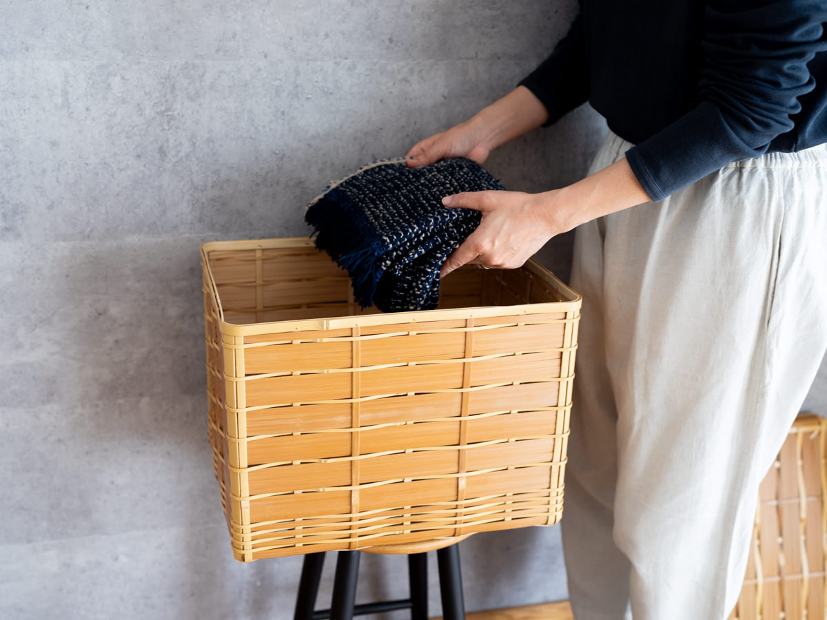 かごの底はじょうぶな「いかだ底編み」仕上げです。筏-いかだ-のような様子からそう呼ばれています。物がこぼれおちないよう、目の詰まった編み目になっています。