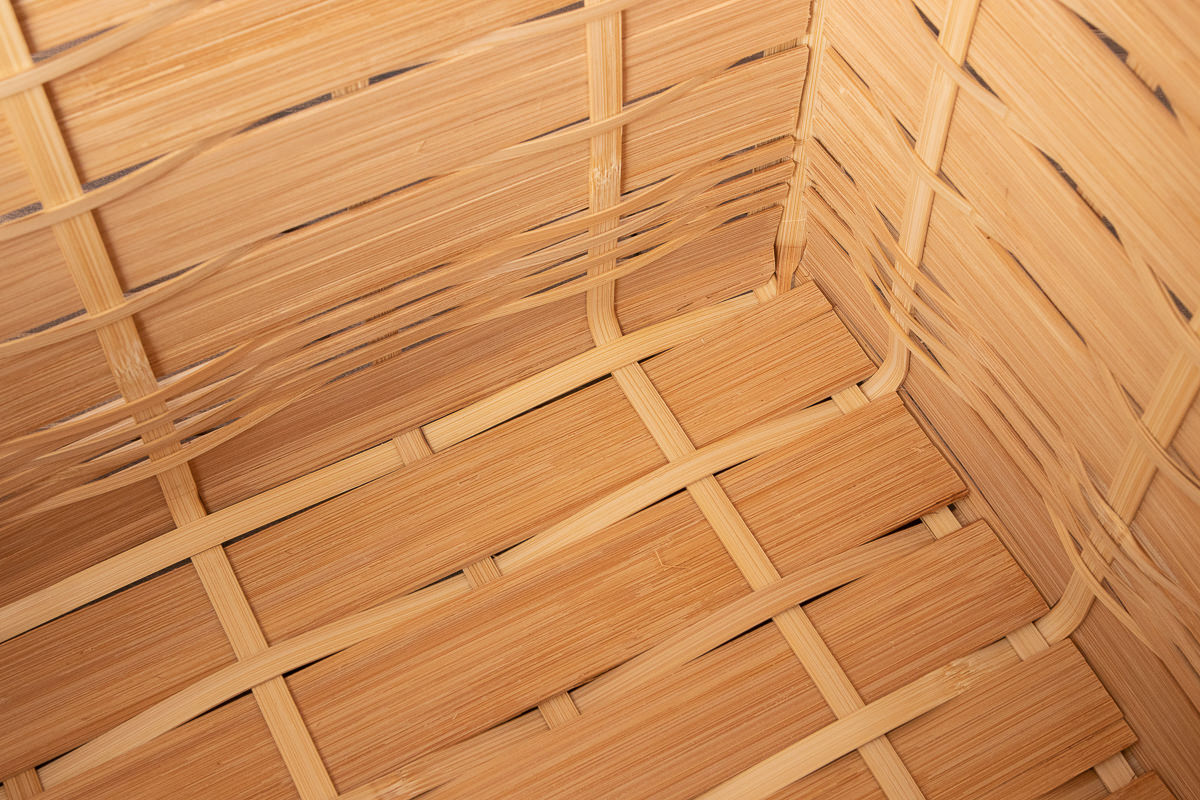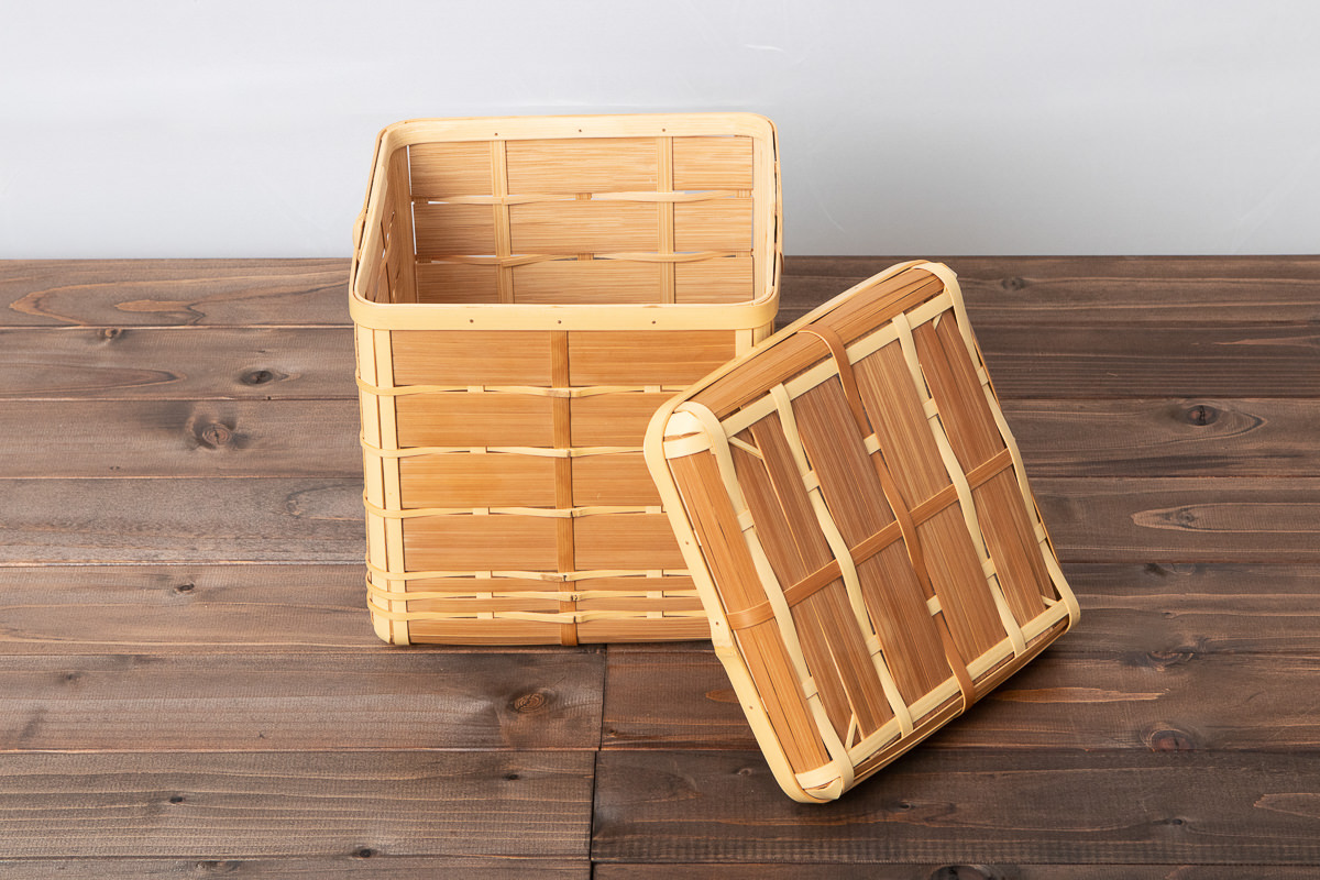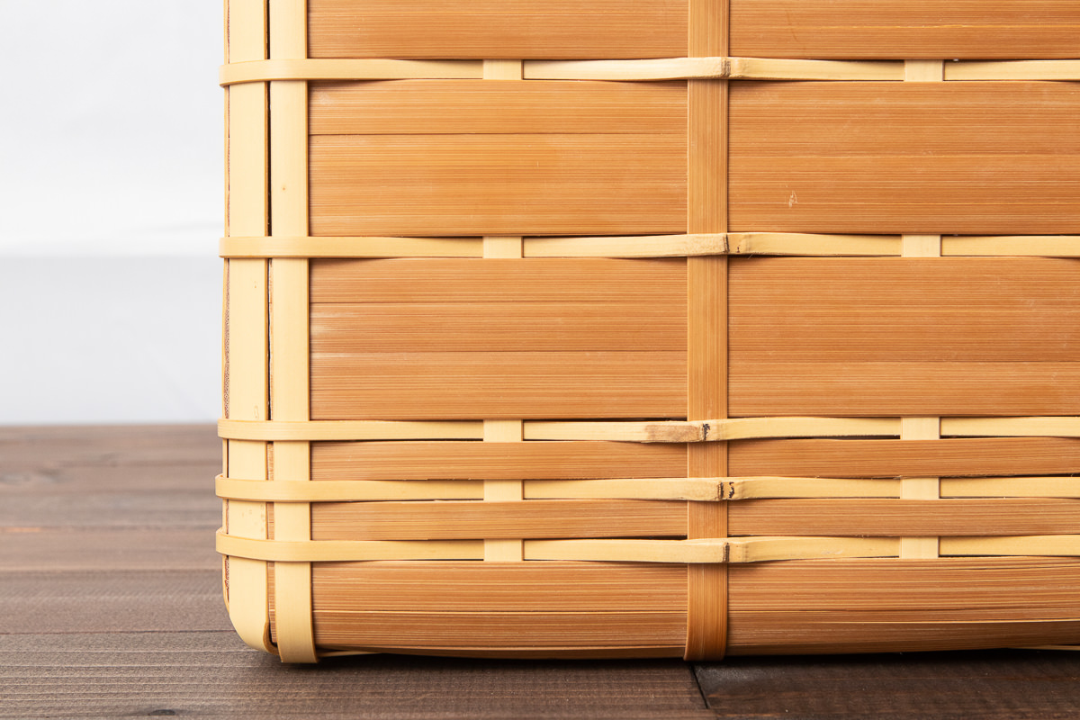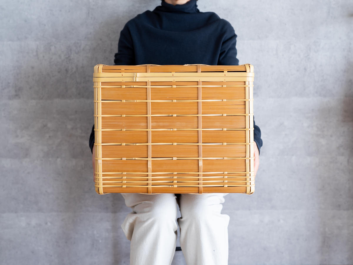 白竹と炭化竹を組みあわせた、箱型のかご。こちらは炭化竹のひご表面をけずることでみがかれており、均一の揃った色味になっています。みがかれているため、時間が経つにつれ、さらにきれいに深く色付いていきます。かごの芯骨となる、縦のひごと横ひごを交互に編みくんでいく、「ござ目編み」をベースにしています。