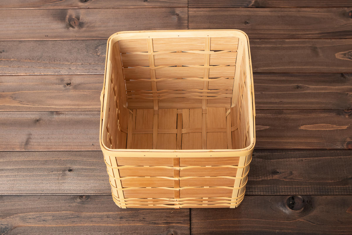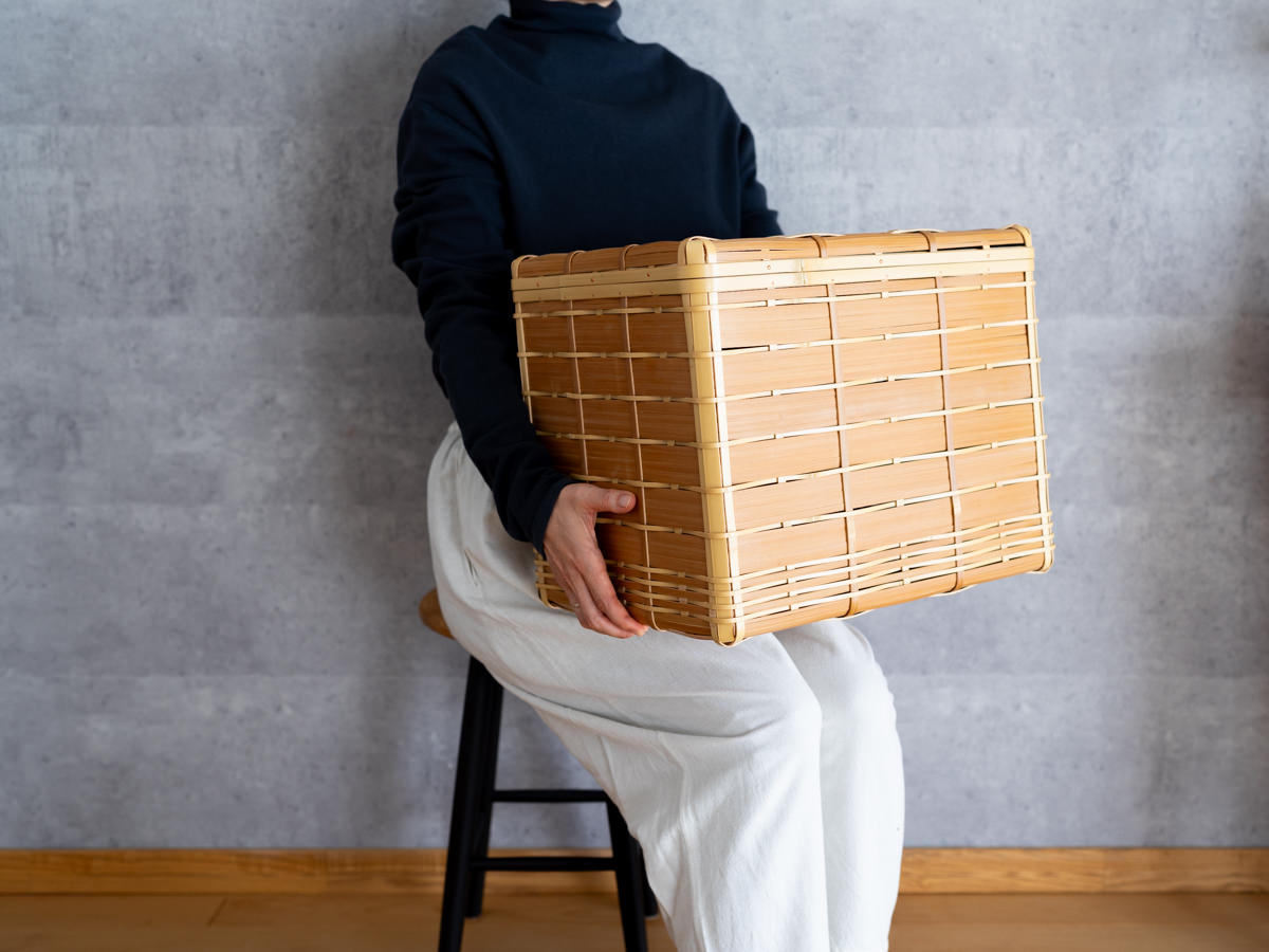 ネーミングのとおり、きりっと、かっちりとしたかごですが、全体的に竹ひごがうすく取られており、持ったときの感覚としては軽やかです。