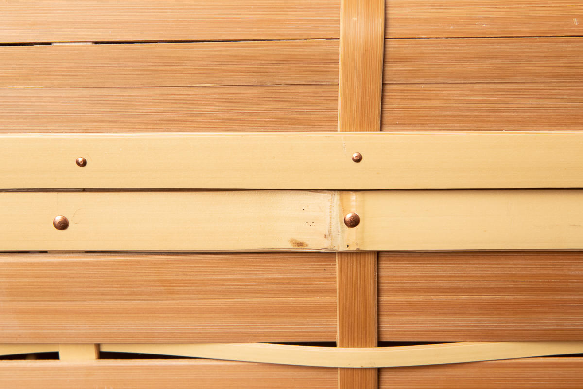こちらは気持ちよく、ピタッと閉まります。竹ひごの、ボコっと出ている節を身と蓋でおなじ位置にくるよう、あわせて作ることもありますが、こちらのかごはつかう方のことを考えてあえて少しゆるめに作られているため、上の写真のように、上と下の節をあわせて閉めなくても、だいたいしっかり閉まります。