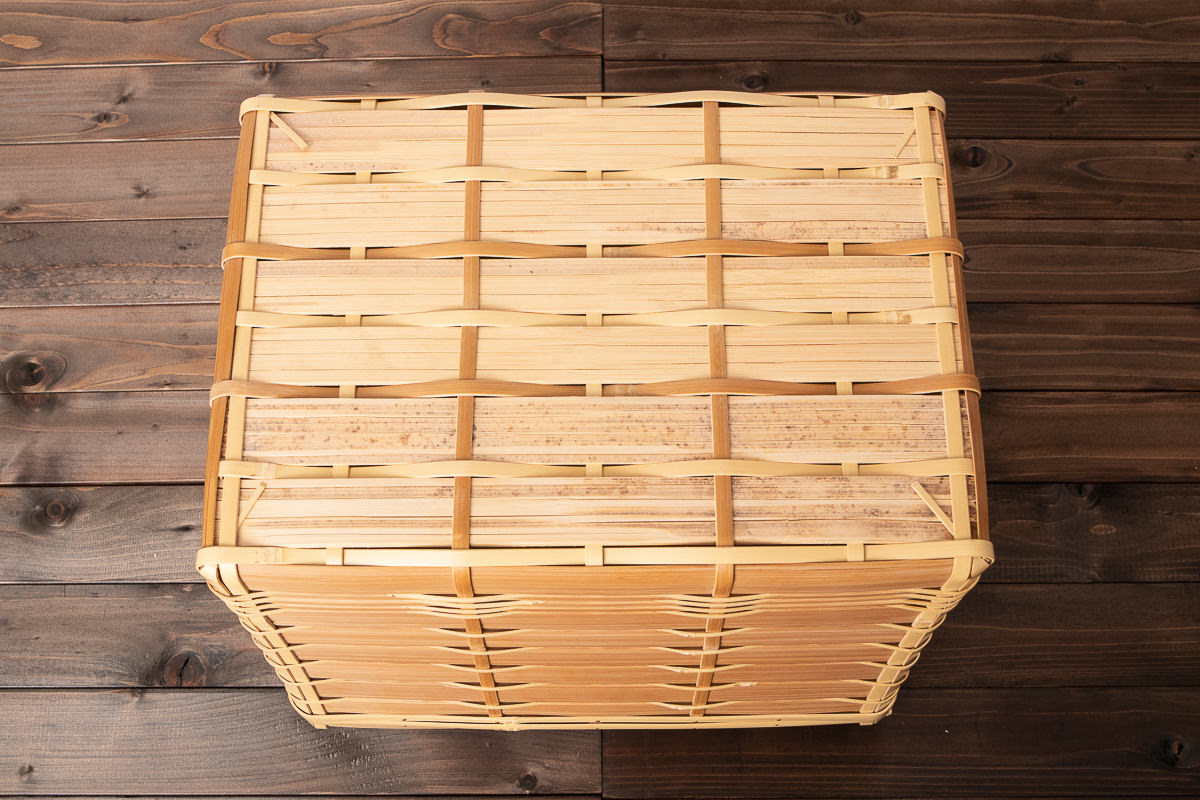 かごの底はじょうぶな「いかだ底編み」仕上げです。筏-いかだ-のような様子からそう呼ばれています。物がこぼれおちないよう、目の詰まった編み目になっています。