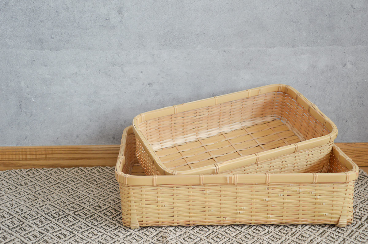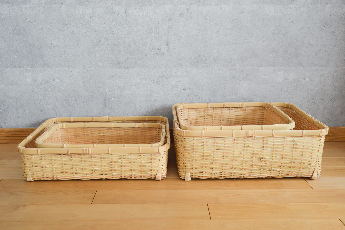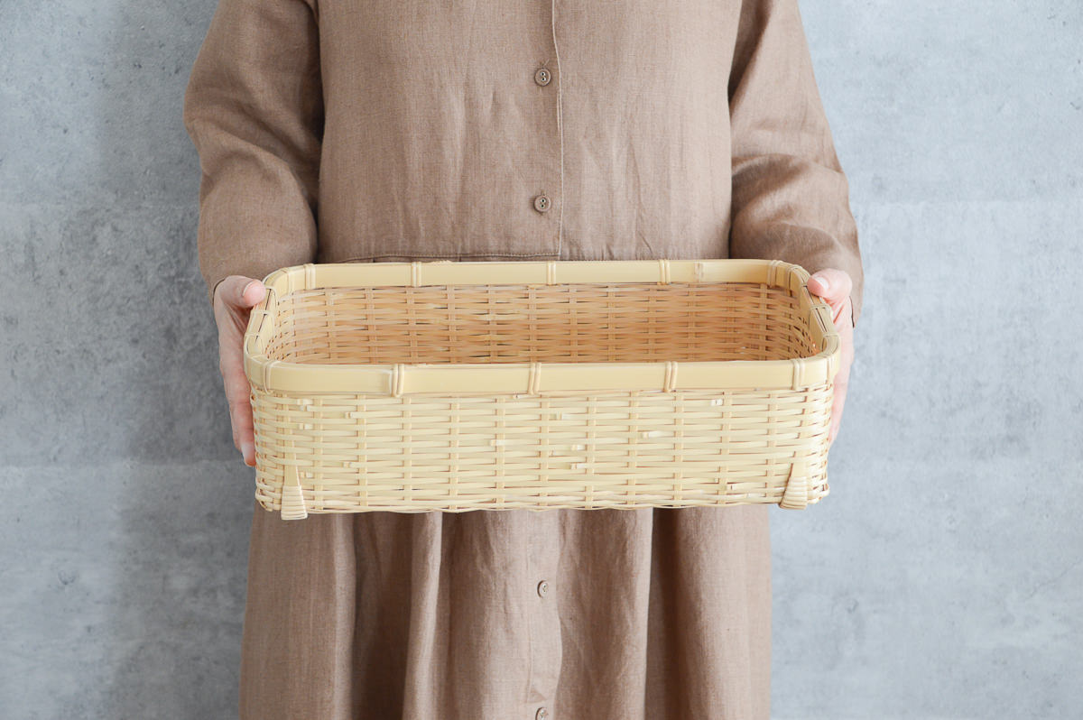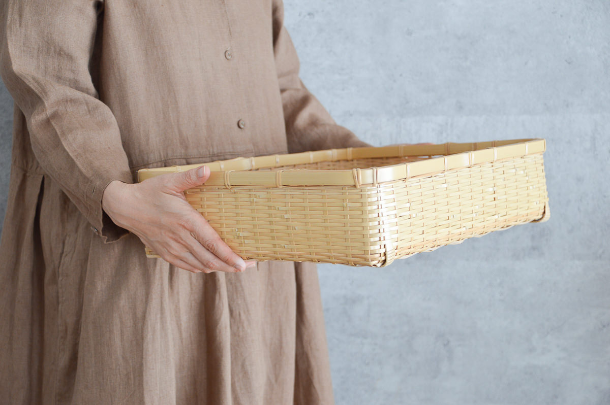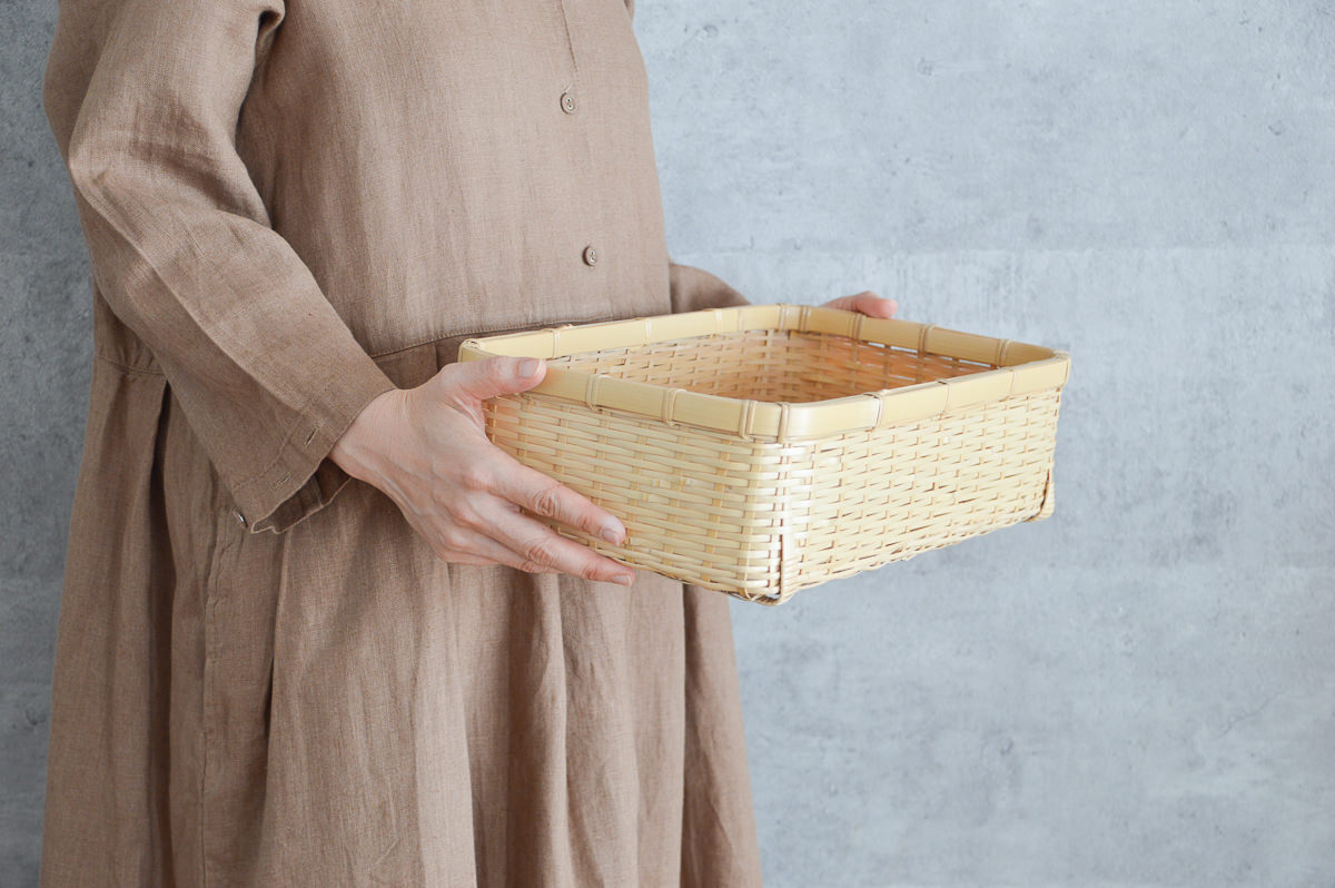 こちらは、白竹を使って作られた、四角くて浅い整理かごです。