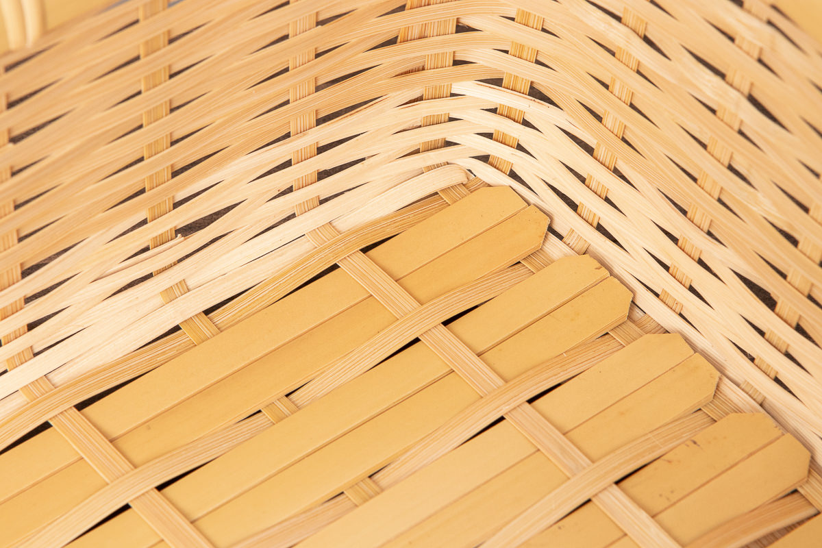 底は「いかだ底編み」で、丈夫な作りです。2本ずつ通された竹には「節(ふし)」がなく、直線が美しく見えます。