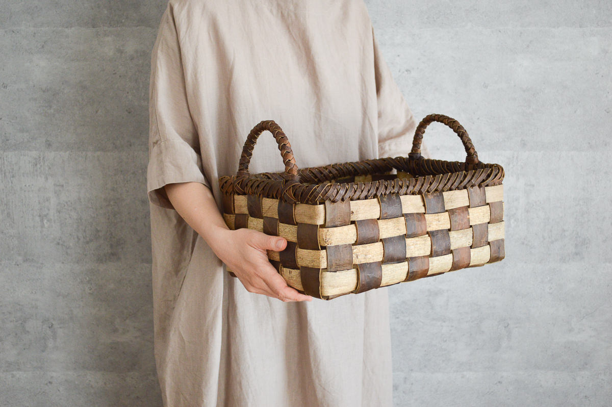 剥いだくるみの樹皮を2.5~4cmほどと幅広く裂き、表皮の淡い茶色と裏皮の深いこげ茶色の違いを利用して、チェック柄になるよう規則的に編んでいます。
