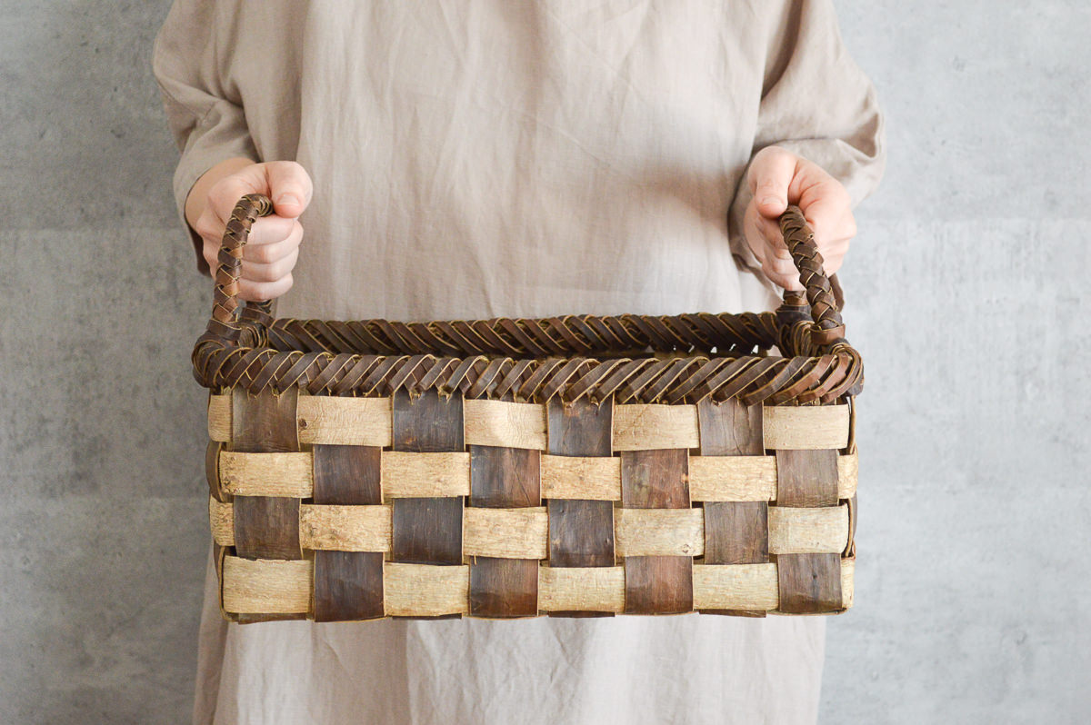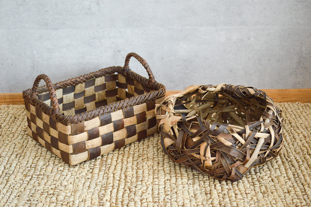 こちらは沢胡桃(さわぐるみ)の樹皮を使って編まれたかごです。