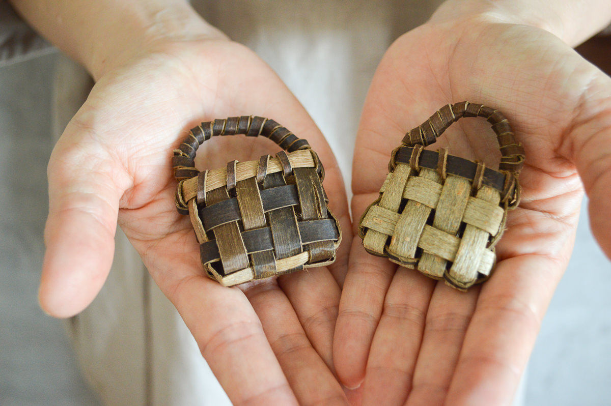 こちらは沢胡桃(さわぐるみ)の樹皮を使って編まれたミニブローチです。