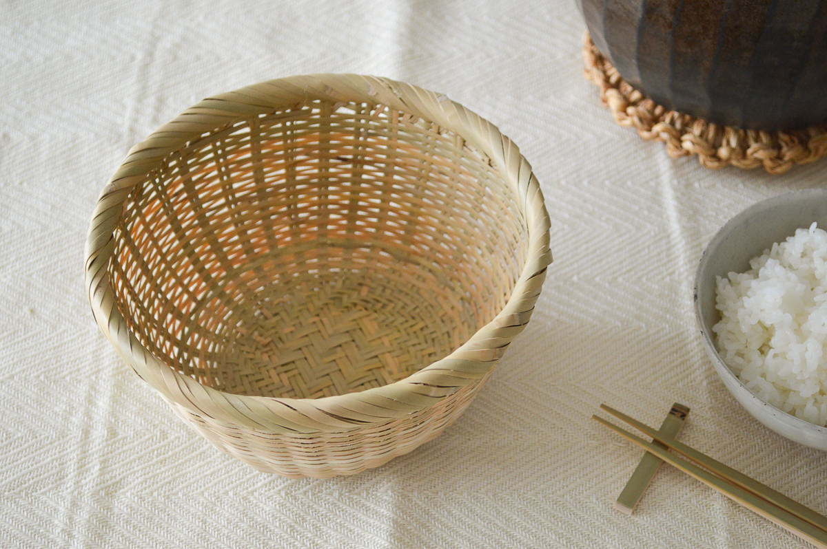 こちらは愛媛県の女竹(めだけ)を使って製作された米とぎざるです。