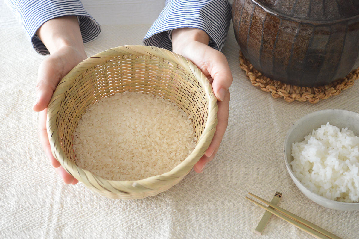 上の写真はこちらのざるに2合のお米を入れたところですが、