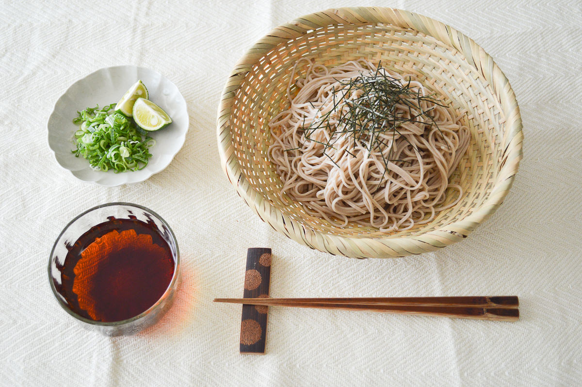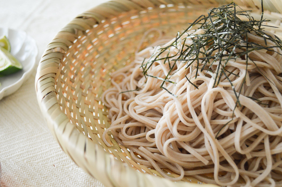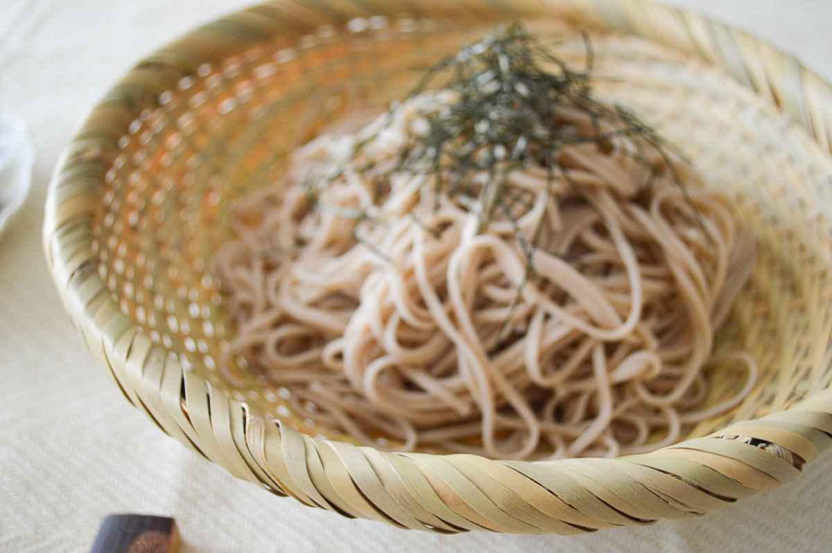 そばを100gほどのせたところです。ざるそばやざるうどん、そうめん、中華麺を盛るのに。
