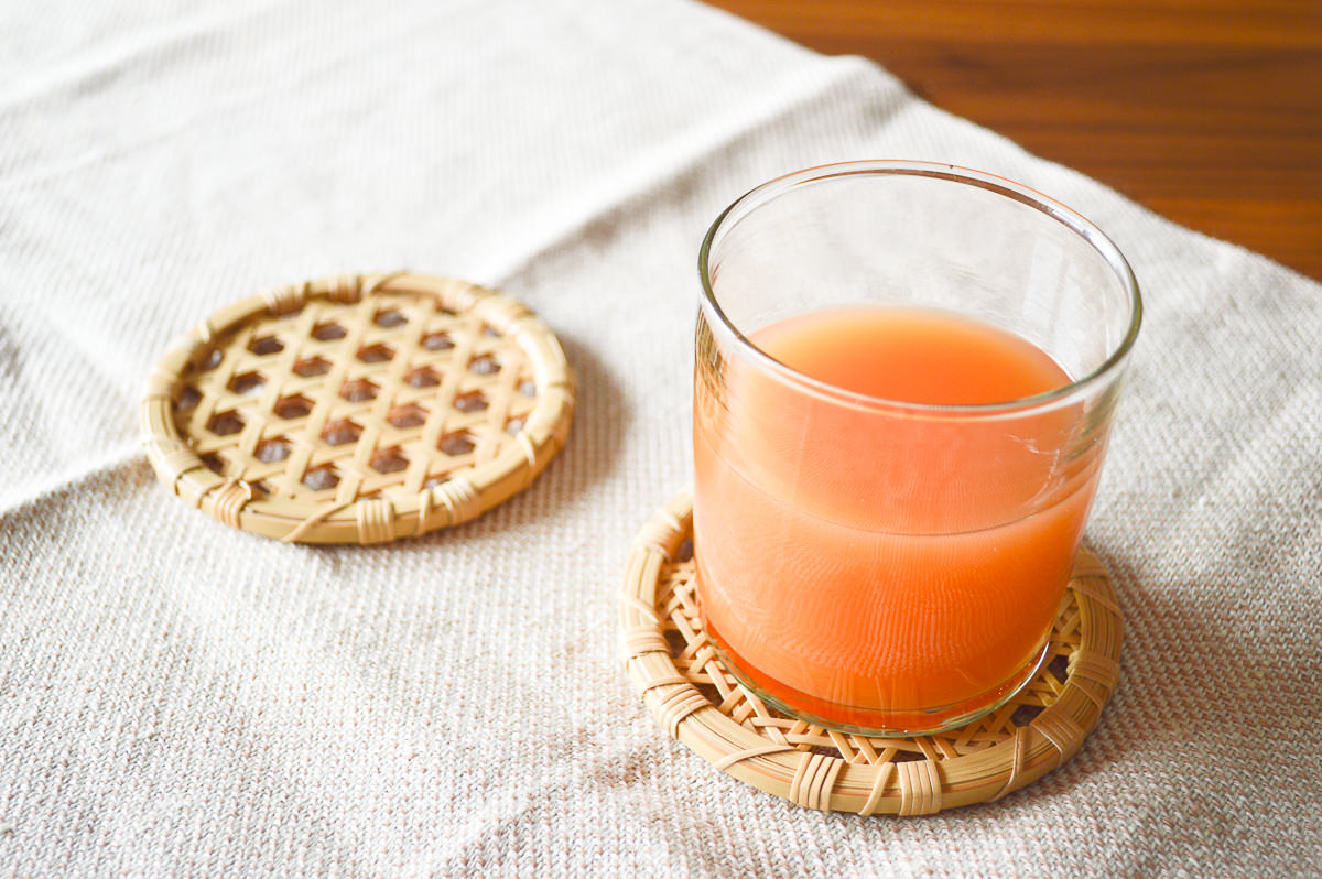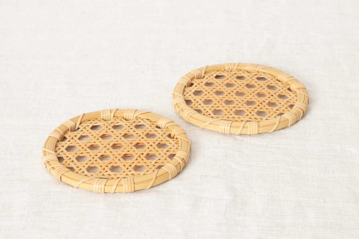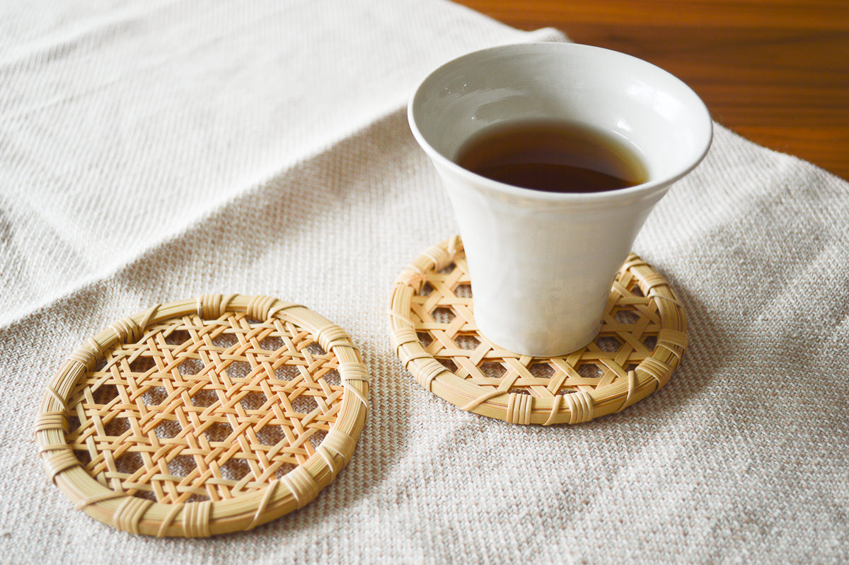 2つのコースターをひとつは表面、もうひとつは裏面を出して、と楽しむのもまた良さそうです。竹の爽やかな色味が、ガラスややきもの、どんな器もその良さを引き立ててくれます。