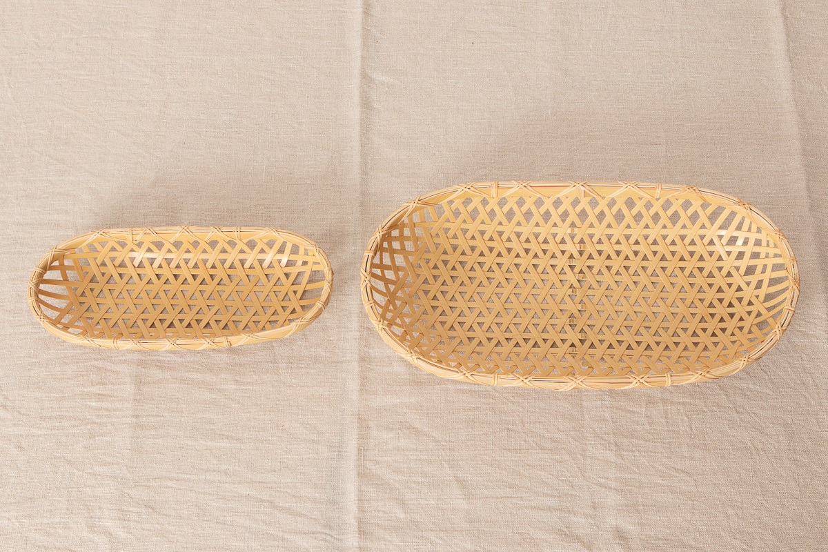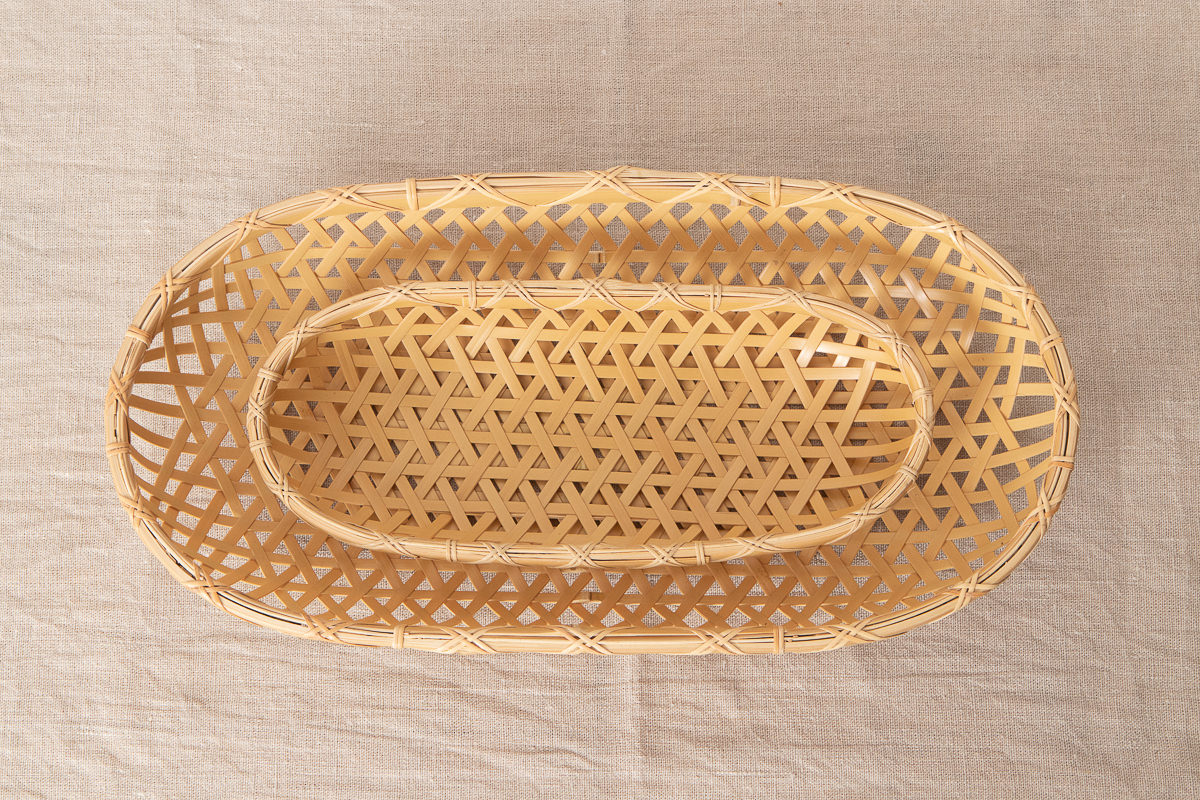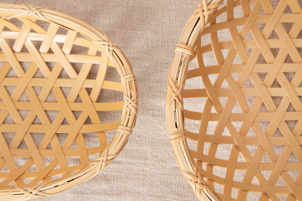 かごの底裏面です。写真では一見わかりにくいのですが、2本の力竹(ちからだけ)が通されています。力竹はつるっとした竹の皮側が表になっています。それでは、各サイズをご紹介します。