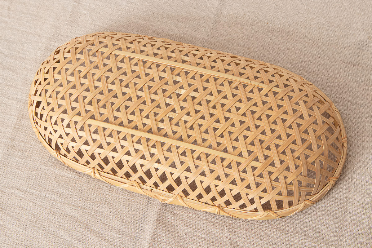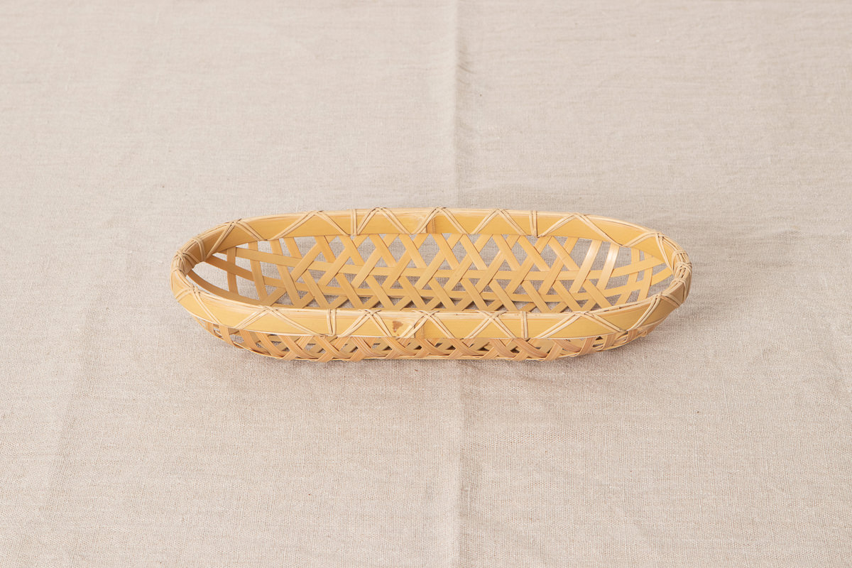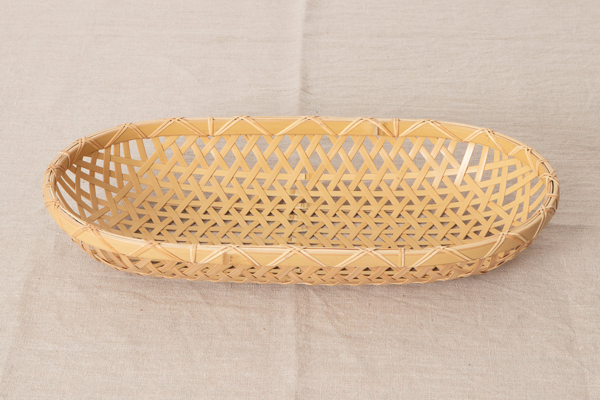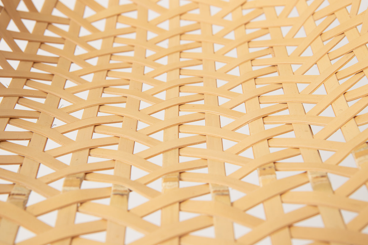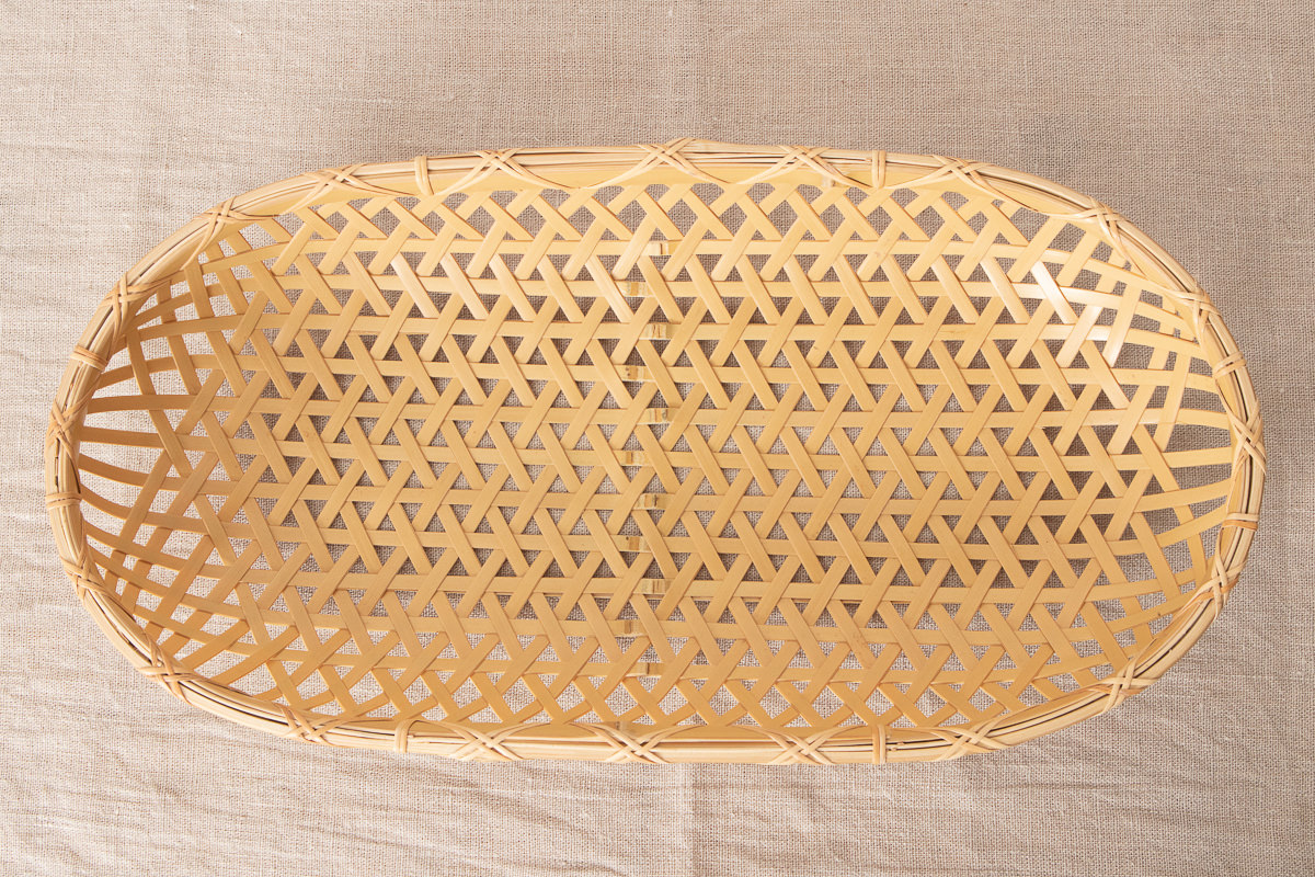 白竹のつるつるとした皮表面の方をかごの内側にして、「麻の葉編み」をベースに編まれています。
