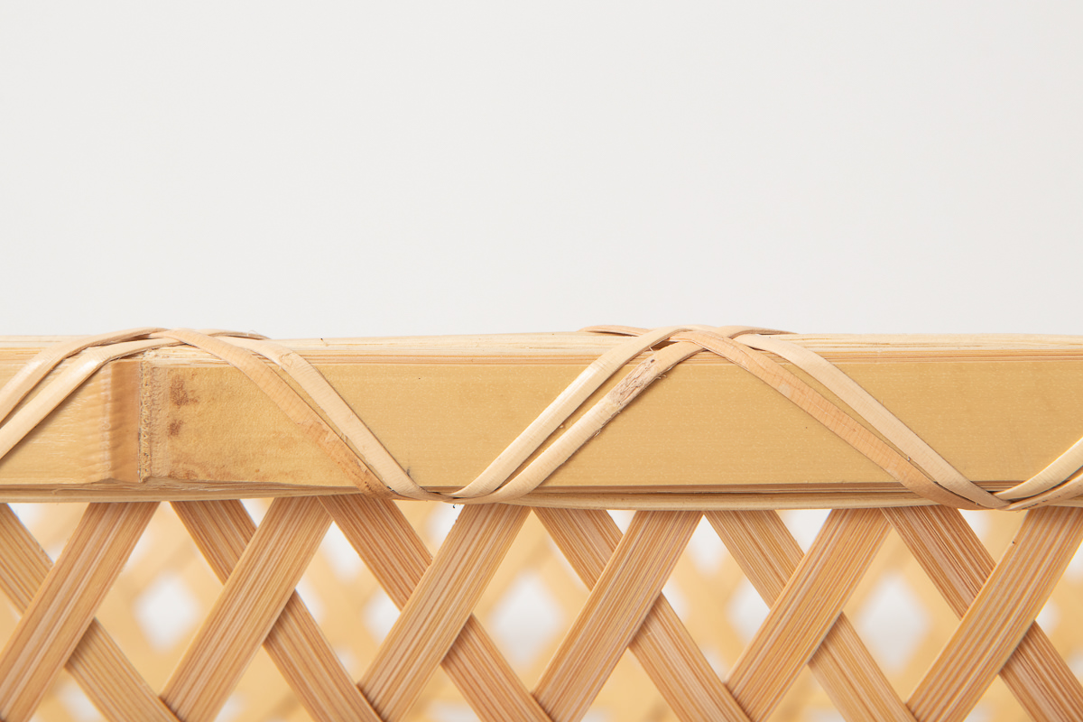 縁の部分です。厚みのある竹ひごを縁にまわし、その上から皮付きの籐(とう)で留めています。
