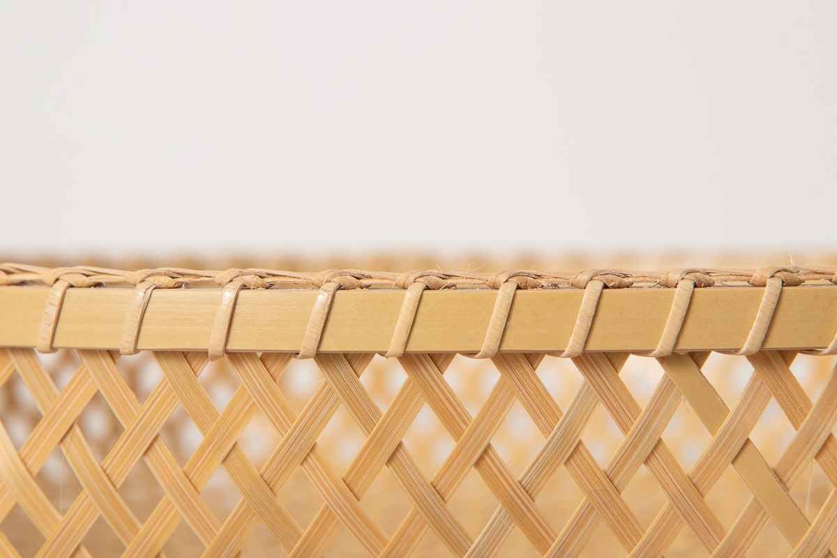 縁の部分です。細い竹ひごを縁にまわし、籐で等間隔に留めています。