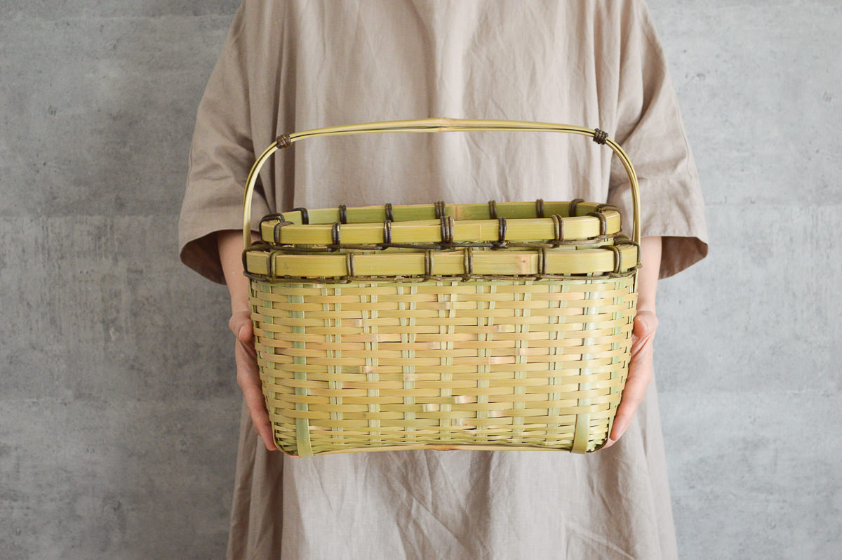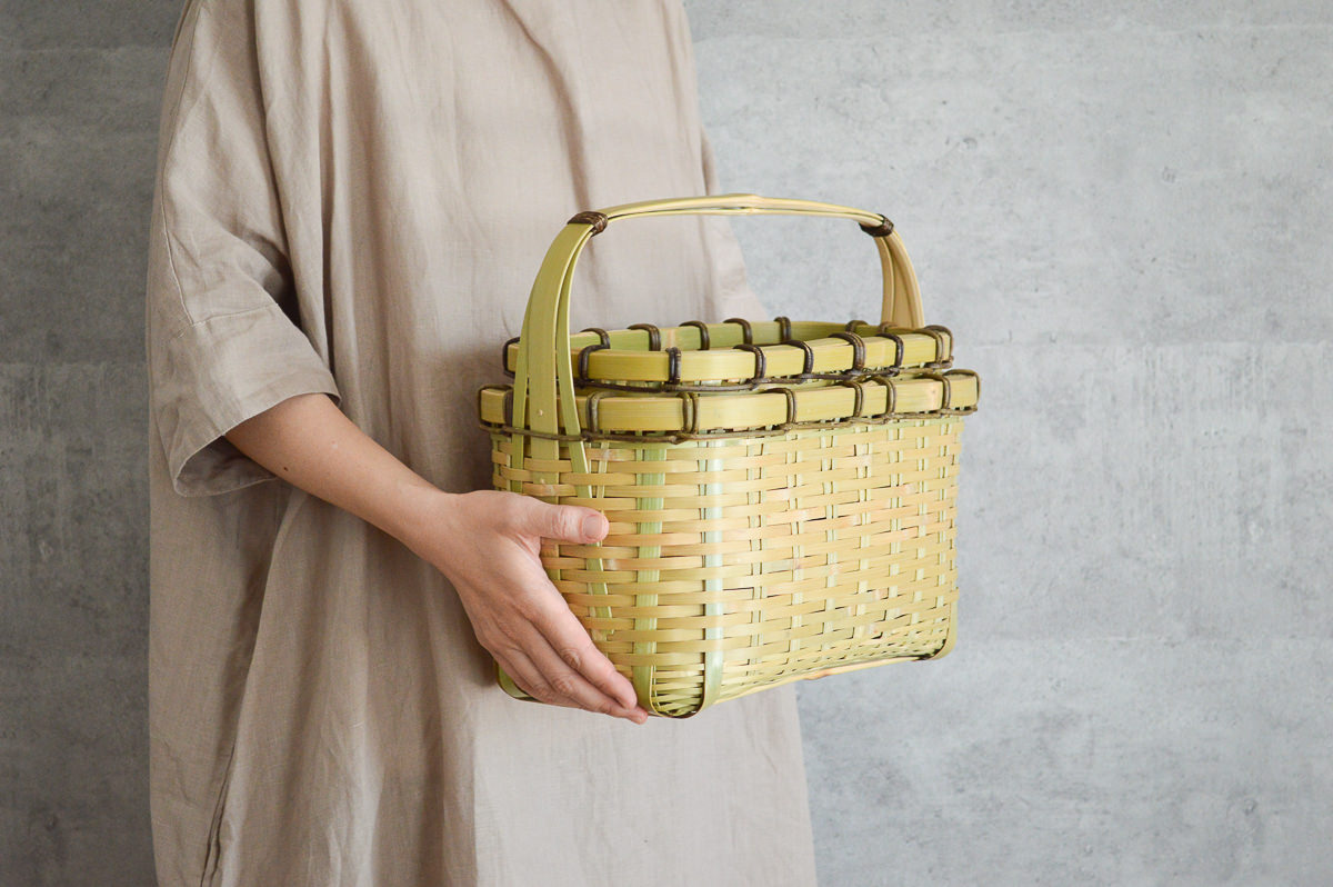 こちらは青い真竹に「みがき」をかけたひごで編み上げた蓋付きのかごです。