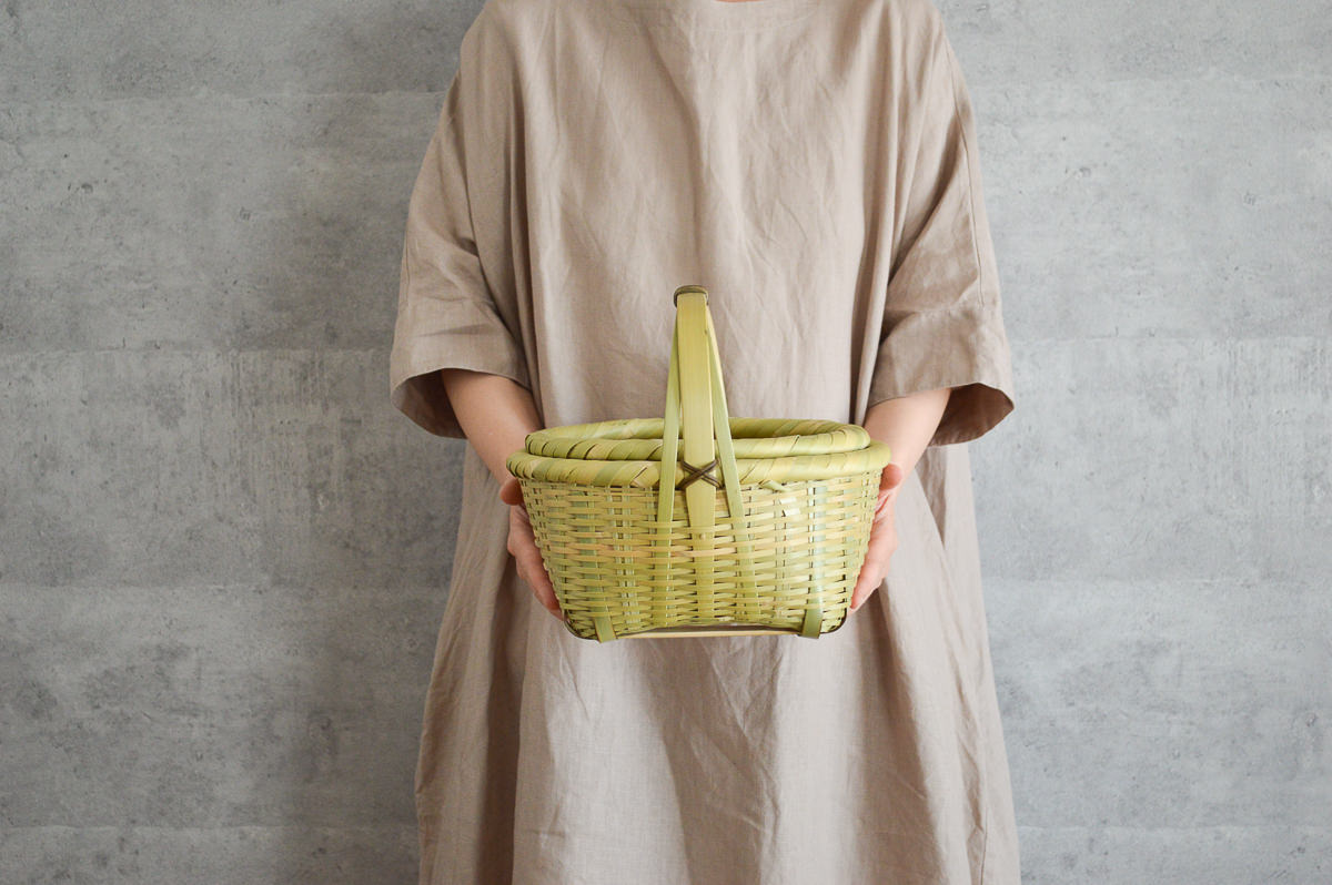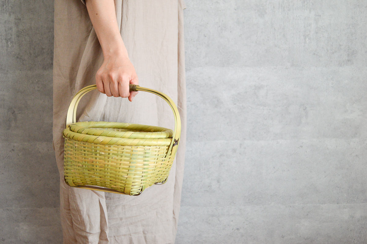 こちらは青い真竹に「みがき」をかけたひごで編み上げた蓋付きのかごです。