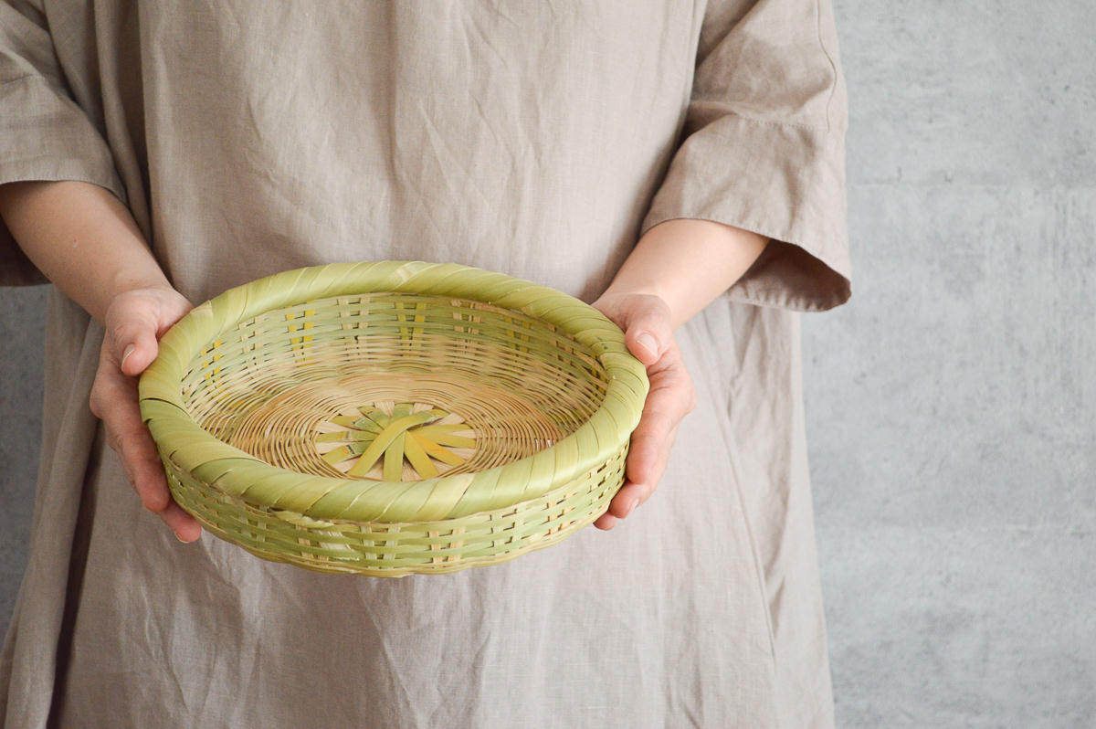 蓋の底の編み方は菊のような模様となることから、「菊底(きくぞこ)編み」と呼ばれています。浅くても身のかご同様にしっかりとした仕上がりです。もはや蓋の概念を超えているように感じます。