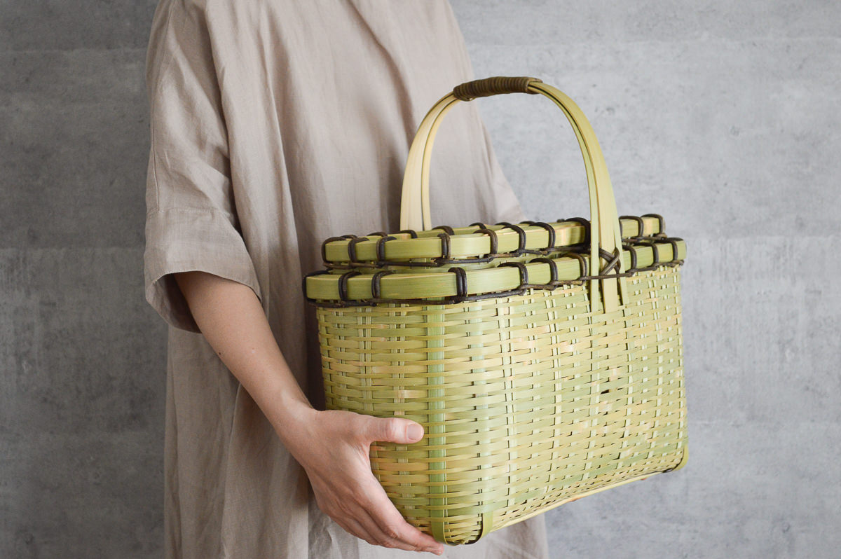 こちらは青い真竹に「みがき」をかけたひごで編み上げた大きな蓋付きのかごです。