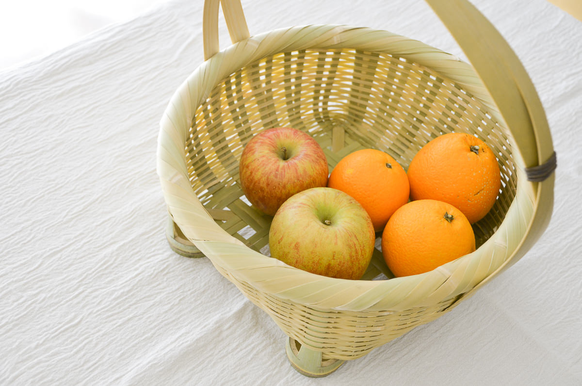 こちらの籠は青竹の表皮を薄く削いだ(「みがき」と言います)竹ひごで編まれています。