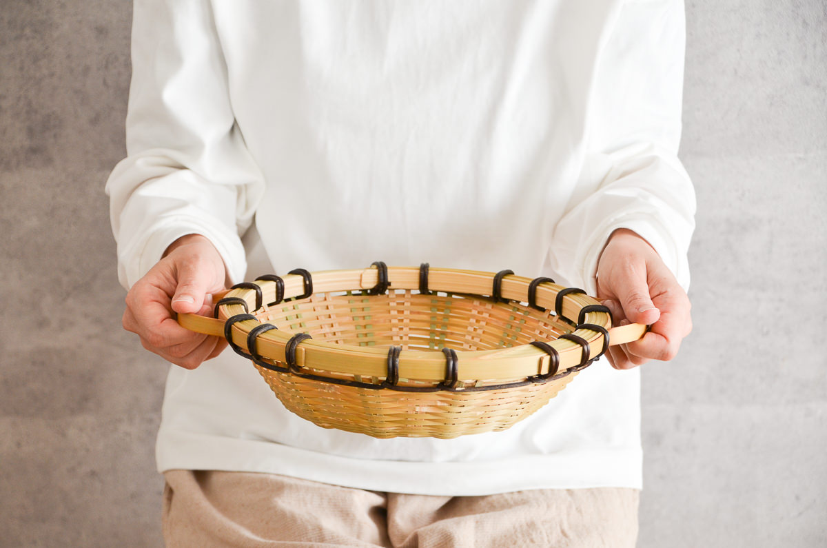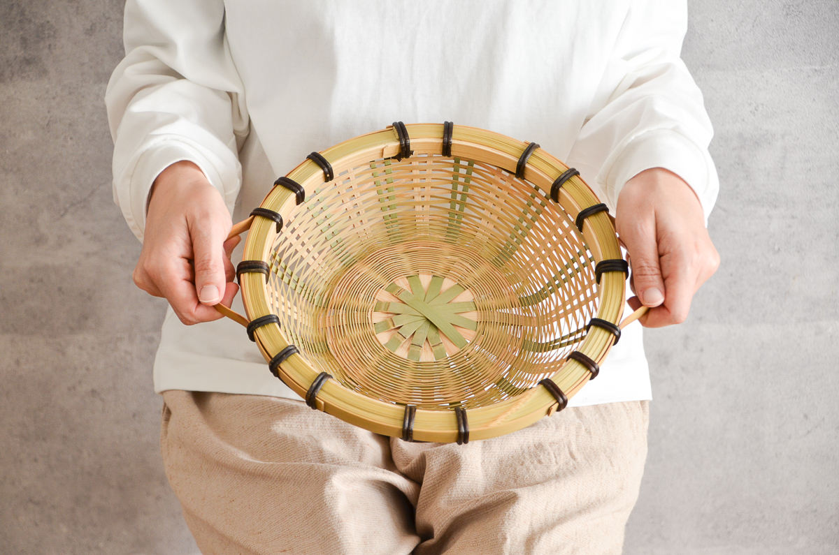 こちらは「青竹」で編まれた、浅く丸い形のかごです。
