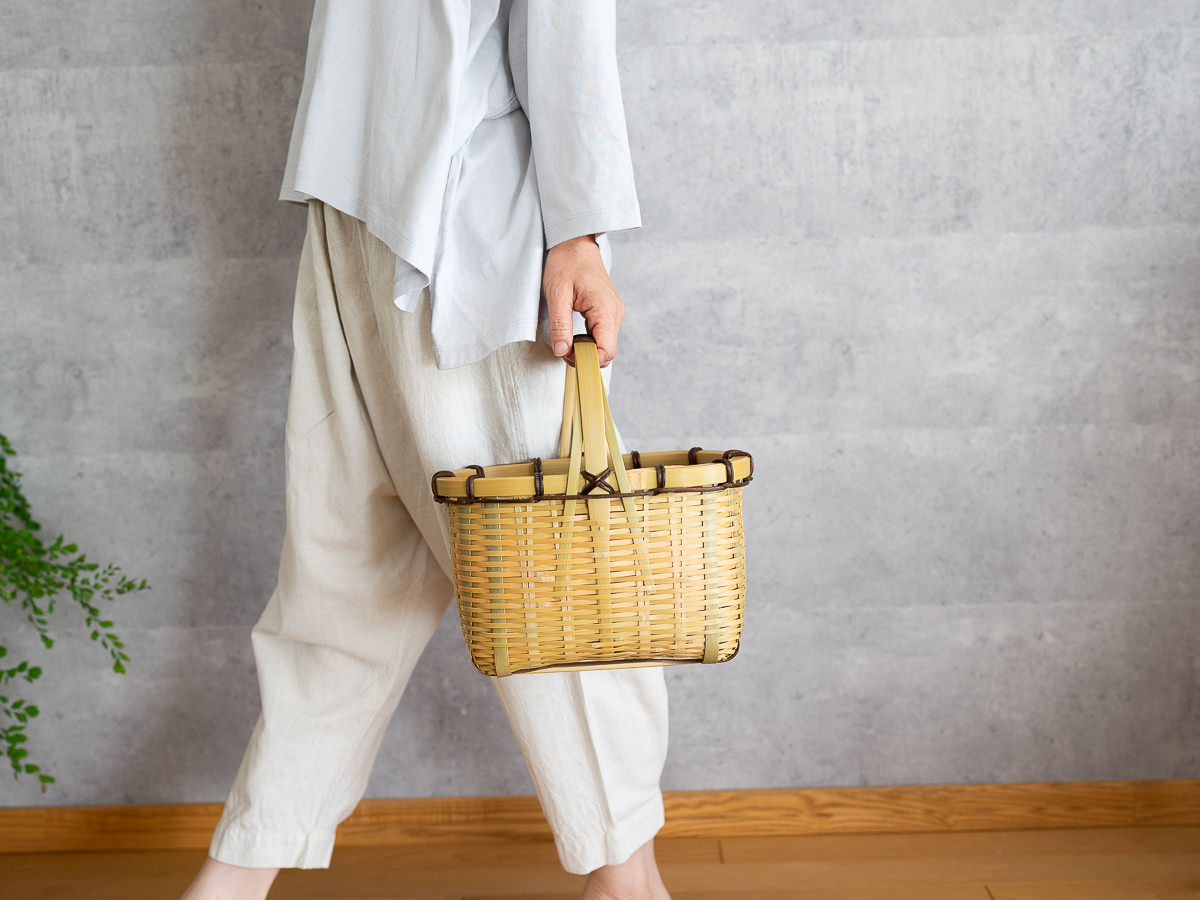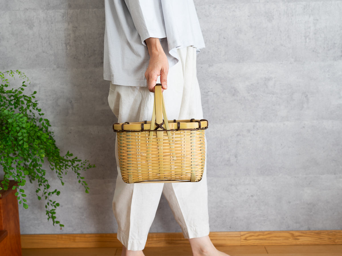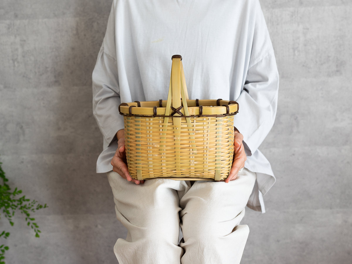 こちらは「青竹-あおたけ-」に“みがき”をかけたひごで、編まれたかごです。