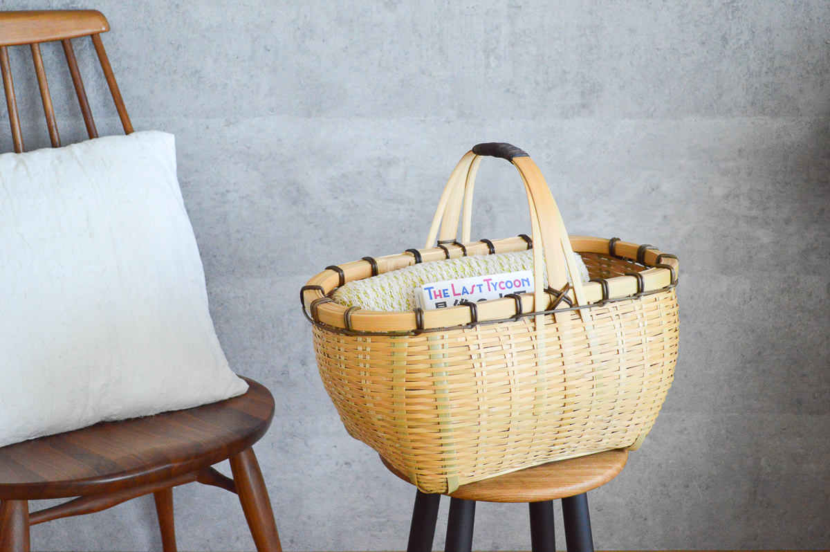 こちらは青竹とツヅラフジで作られた「手つきリビングバスケット」と名付けられたかごです。