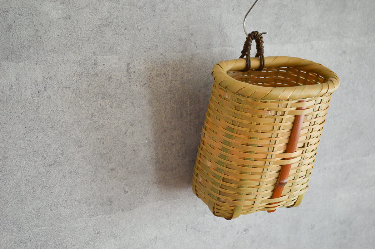 こちらは青竹とツヅラフジで作られた壁にかけることができる「掛け籠」です。