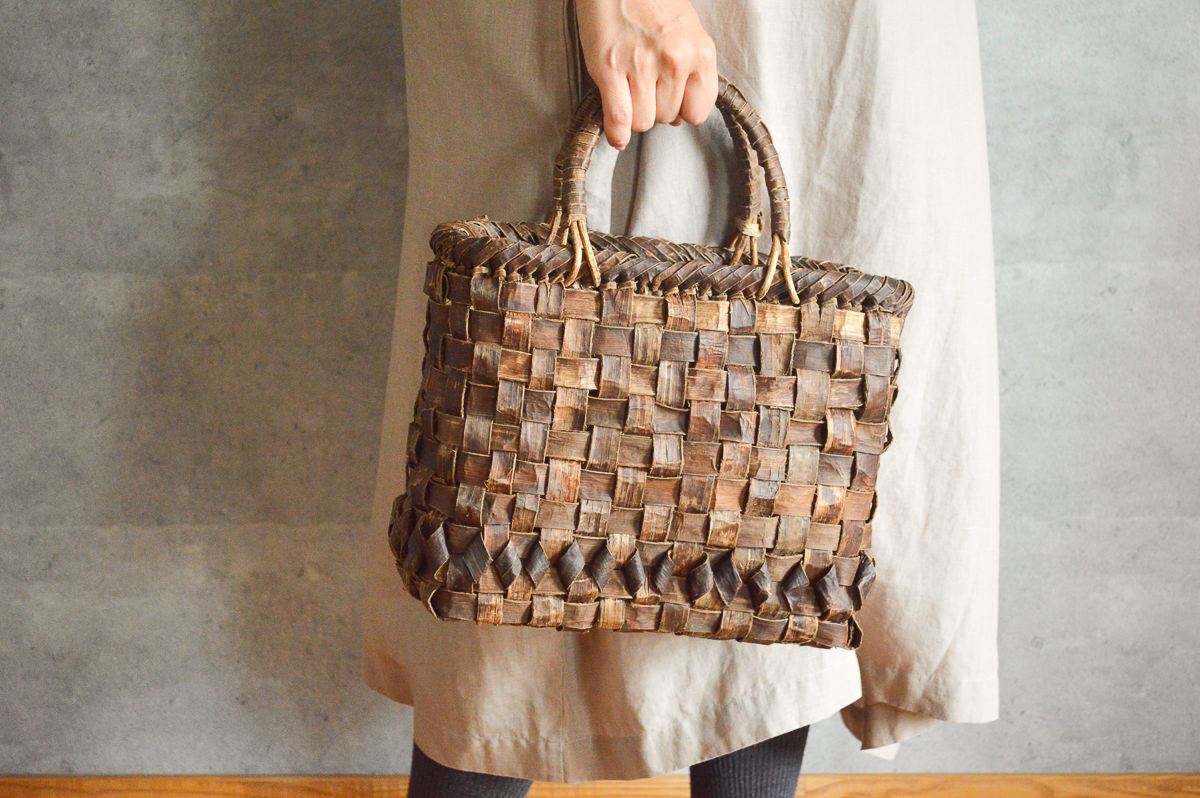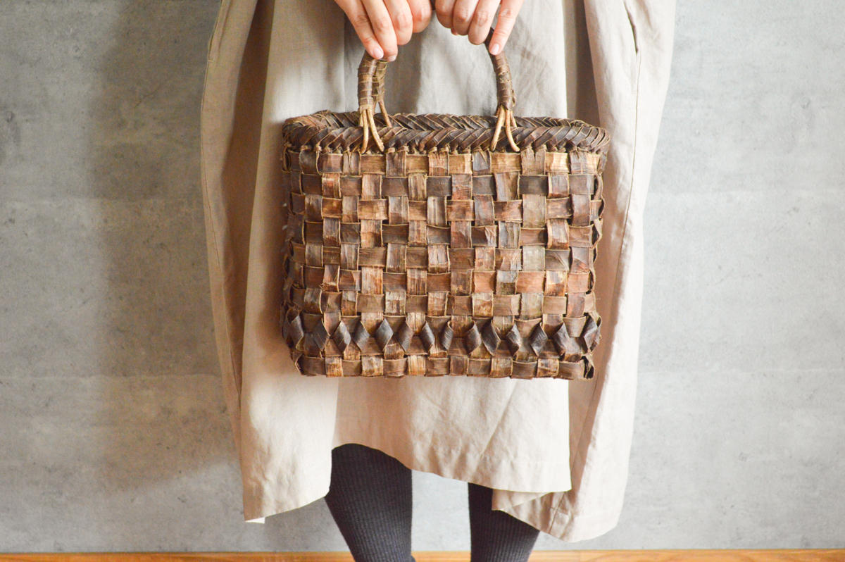その中でもこちらは、くるみの樹皮をメインに使って編まれた手提げです。