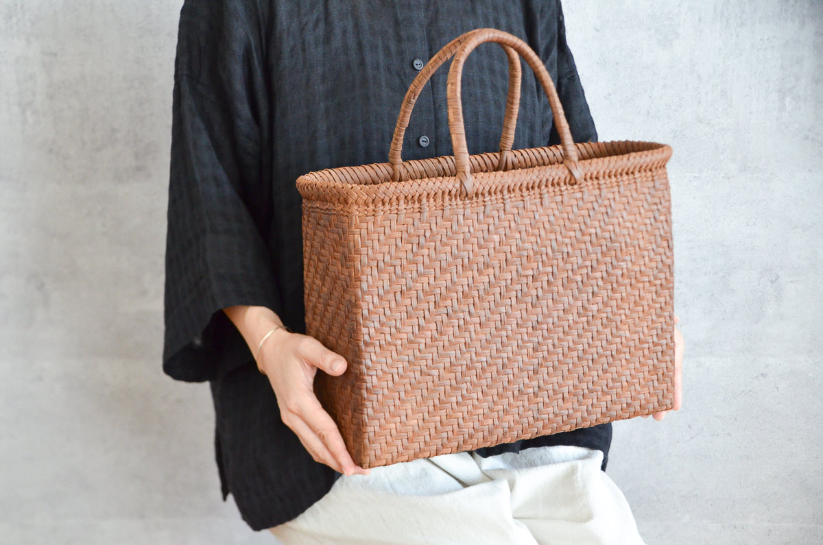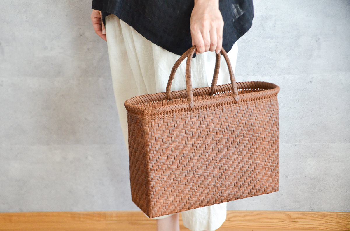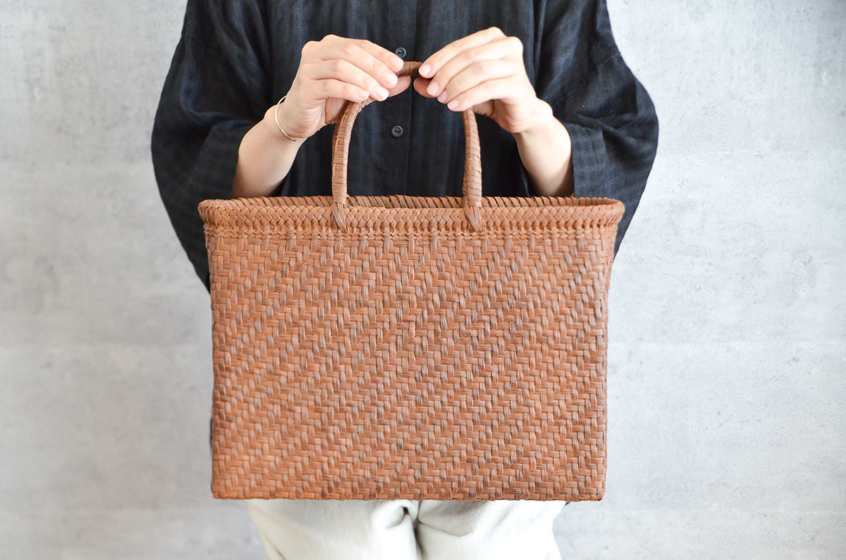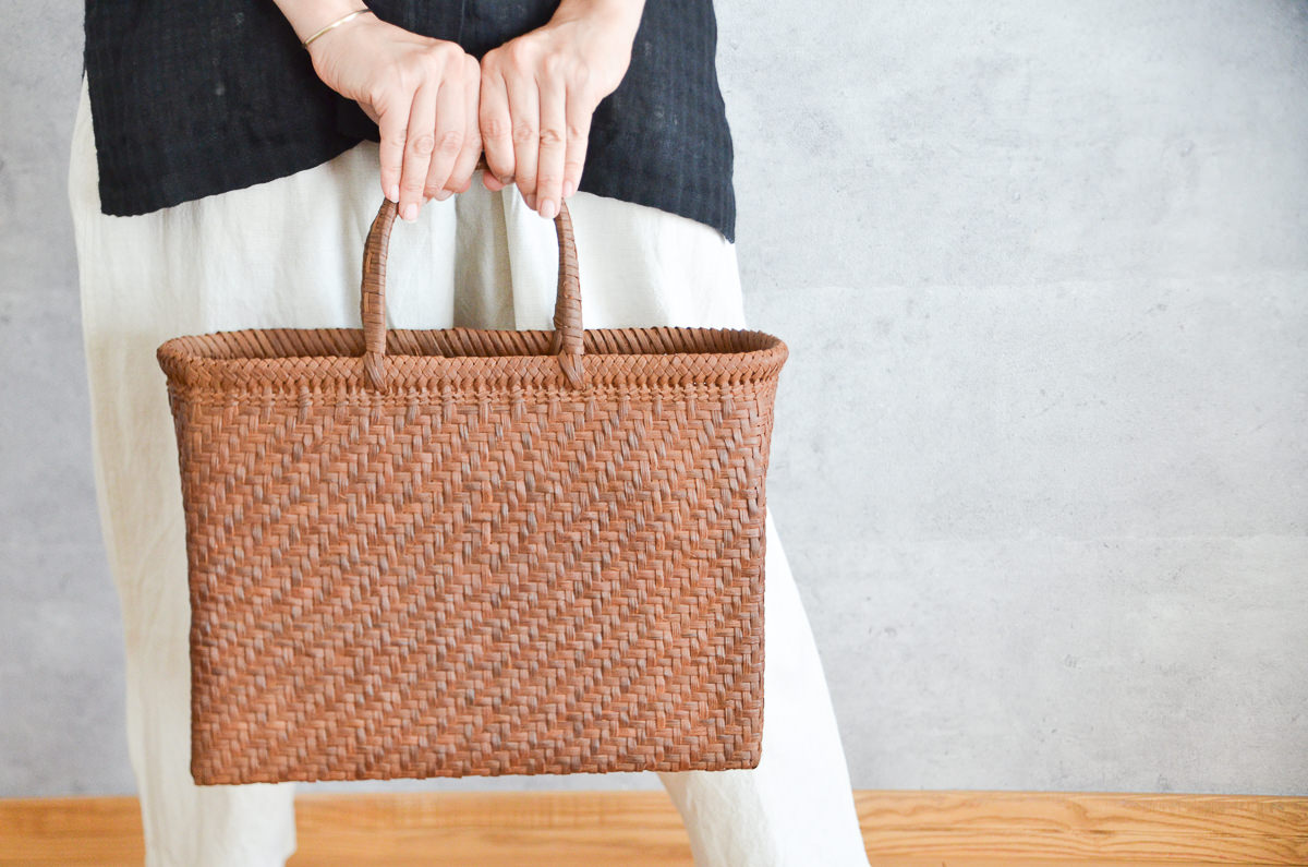 一本のひごが細く薄く仕立てられているため、これだけたくさんのひごがぎっちりと編まれていても、かご自体はそんなに重量を感じません。荷物を入れても軽やかに持てそうです。